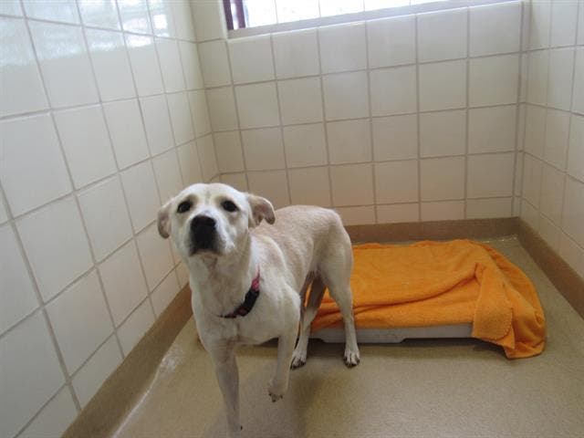 Sex, Breed: Spayed female, white and tan Labrador Retriever mix.