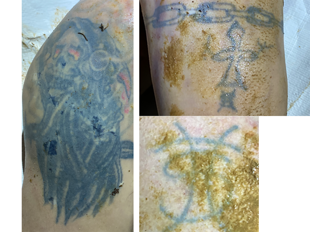 Police released photos of several distinctive tattoos that may help members of the public identify the victim. One of the three tattoos includes the grim reaper holding a handgun and another shows chain links with a cross underneath.