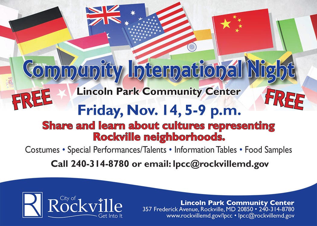 Share and learn about cultures representing Rockville neighborhoods. Event will include a variety costumes, special performances/talents, informational tables and food samples.