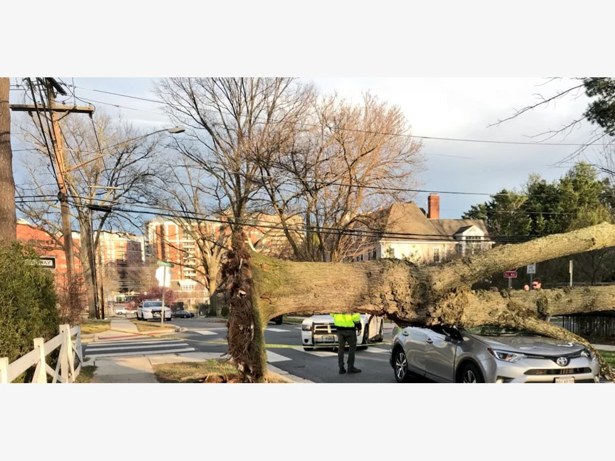 At around 12:30 p.m. in Chevy Chase, a large tree fell in the 4000 block of Thornapple Street, blocking traffic and taking down power lines. "Pepco has not provided a specific timeframe for tree removal and power restoration," town officials said in a statement.
