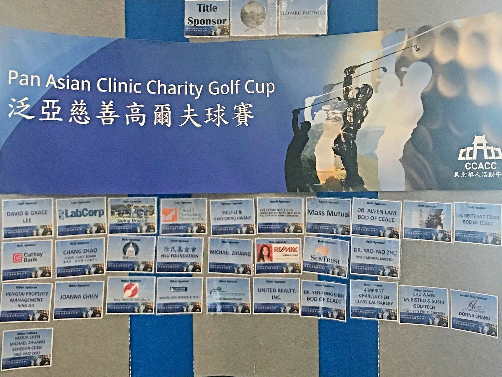 Tee (Hole) Sponsors: Beautiful Life Salon, SunTrust, Miss Ye Li of RE/MAX, the Hsu Foundation, Cathay Bank, Michael Zhuang, DSFederal Inc., Dr. Yao-Yao Zhu, CCACC Chairperson of the Board Chang Zhao, CCACC Boardmembers Alven Lam and Bertrand Tzeng
