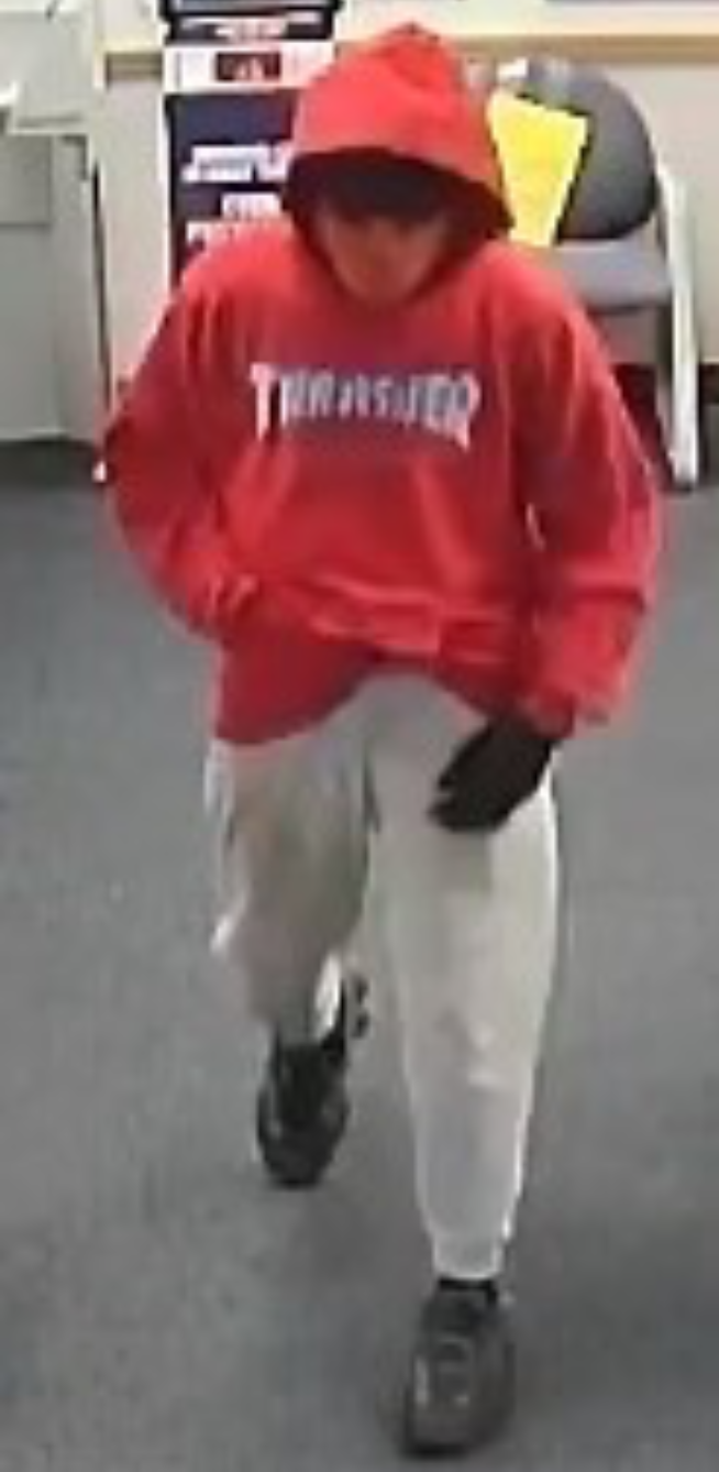 The suspect is described as being 5-foot-6 and having a thin build. Police say he was wearing an orange mask, a red hooded sweatshirt with white lettering, tan pants and black boots at the time of the robbery.