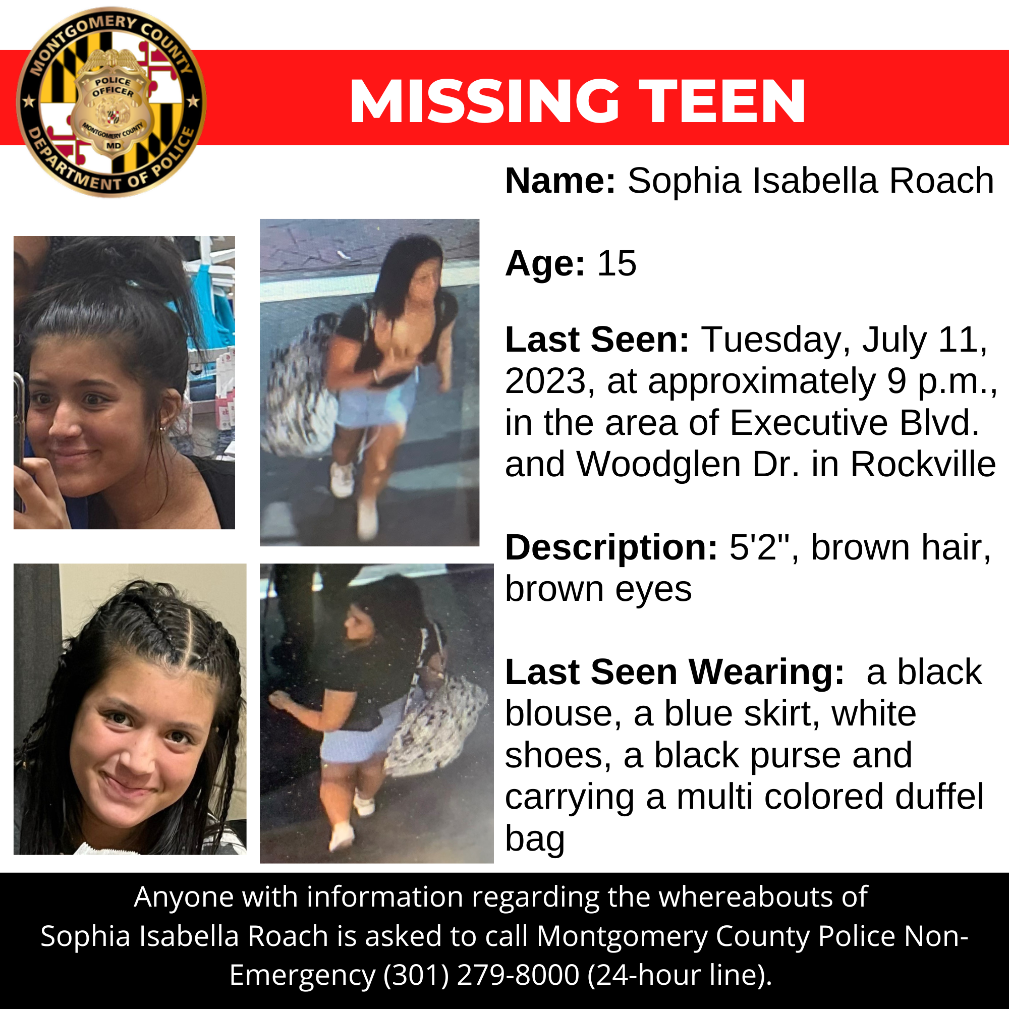 ROCKVILLE, MD — Montgomery County Police are asking the public's help in locating 15-year-old Sophia Isabella Roach, who has been missing since July 11.