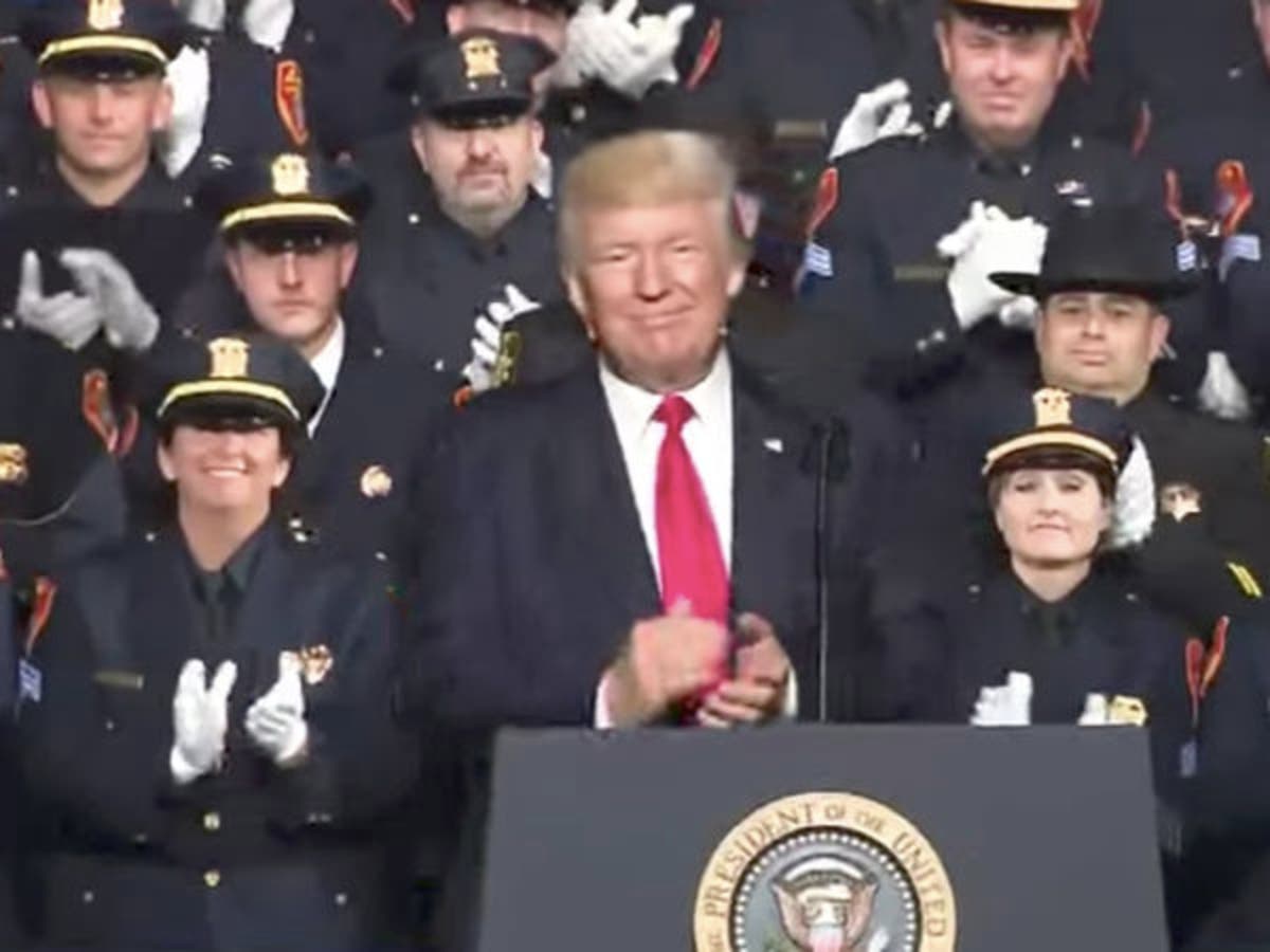 Several local New York officers could be seen smiling and clapping behind Trump as he urged police officers to be rough with those in police custody. "And when you see these towns and when you see these thugs being thrown into the back of a paddy wagon -- you just see them thrown in, rough — I said, please don’t be too nice," Trump said.