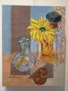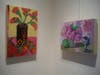 Bobbi Shulman combines densely patterned papers with bright colors redolent of Matisse's in her painted collages of still lifes.