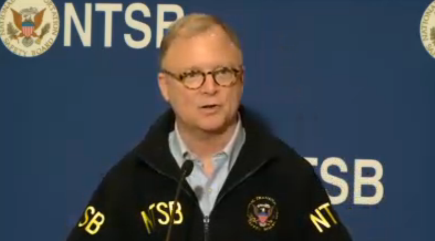 »National Transportation Safety Board spokesman Robert Sumwalt briefs reporters on a fatal plane crash in Gaithersburg. Screenshot from WUSA TV.