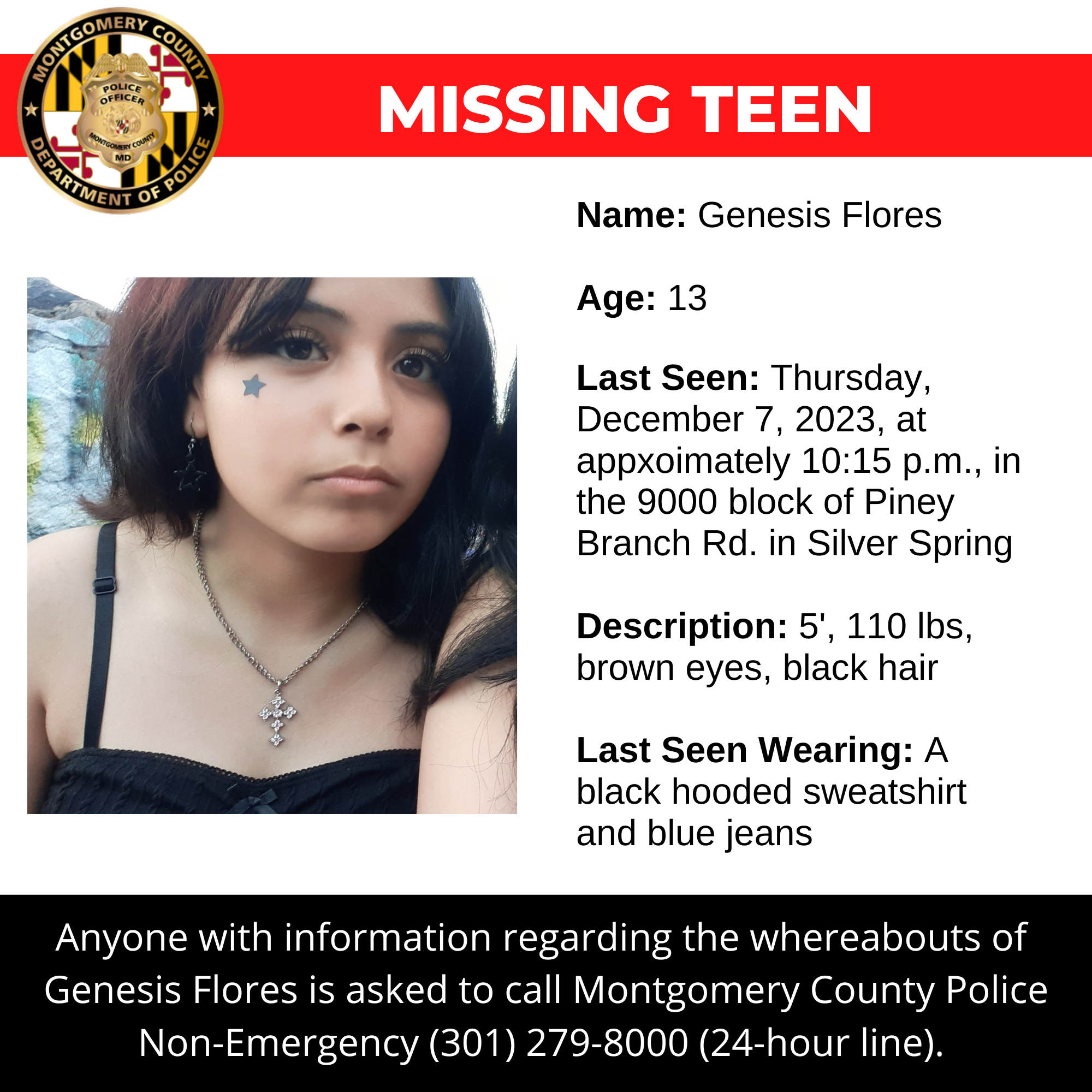 Gaithersburg, MD - Detectives from the Special Victims Investigations Division (SVID) is asking for the public's assistance in locating Genesis Flores, a missing 13-year-old from Silver Spring.