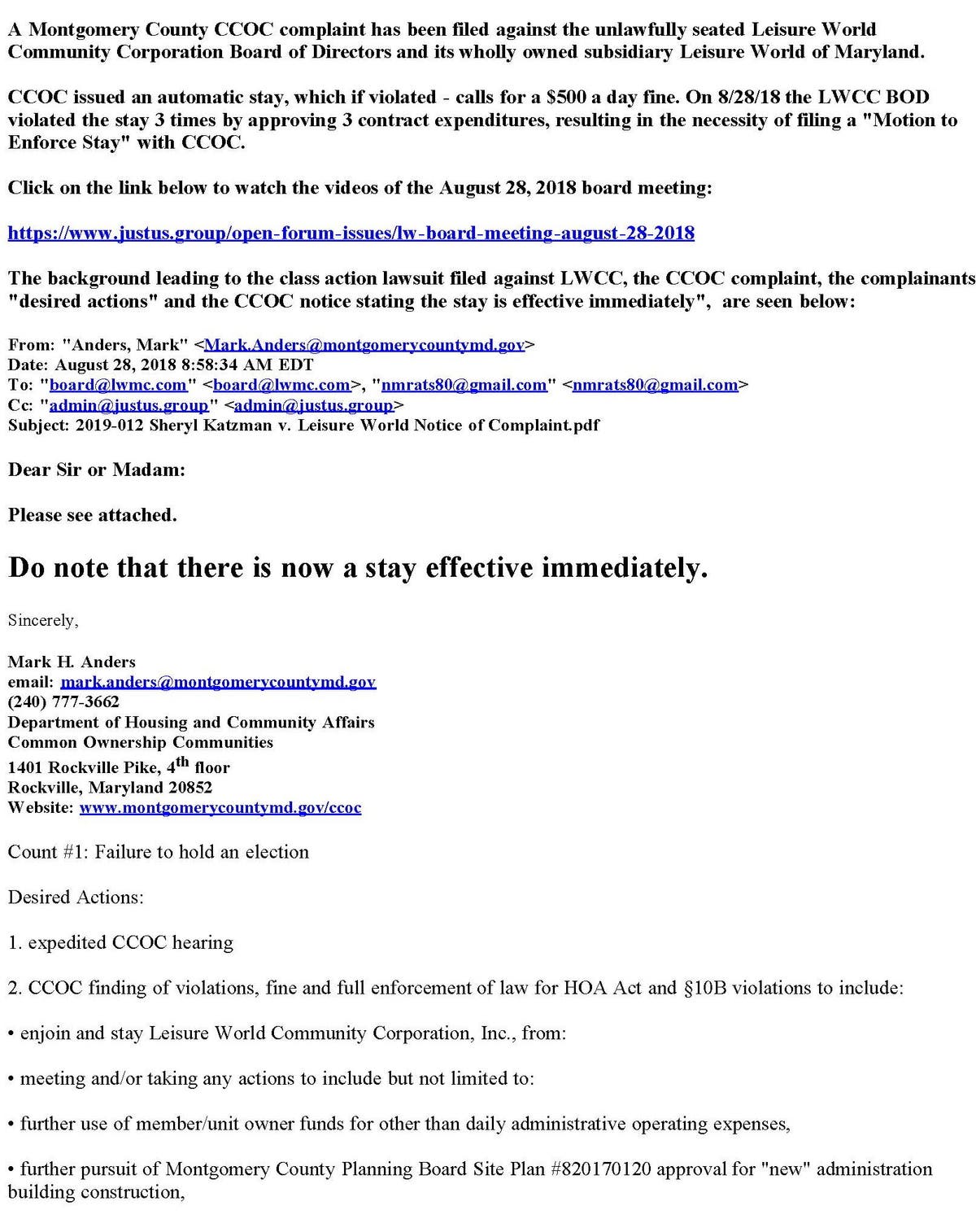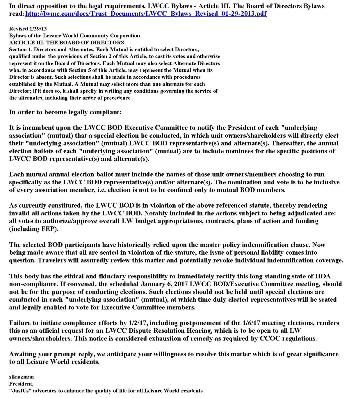 When asked in the January, 2017 Leisure World Board of Directors meeting for a reply to the notices, then Chairman David Frager announced, "see you in court."