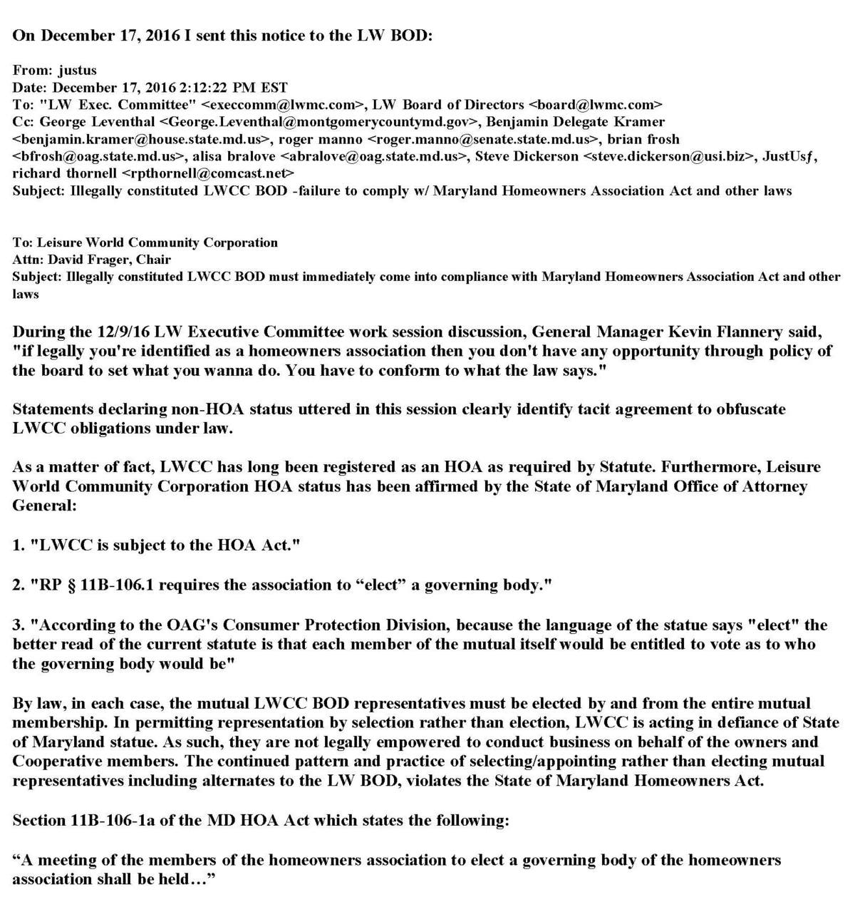 The LWCC has been a registered homeowners association in the State of Maryland since 1988. Though having been on notice regarding their noncompliance with the HOA Act as far back as 2012, the Leisure World Community Corporation and its wholly owned subsidiary management corporation, Leisure World of Maryland Corporation, continue to violate the rights of the member/unit owners by ignoring all notices and refusing to amend the governing documents, continue holding illegitimate annual LWCC Executive Committee elections, and permitting the BOD to meet and take actions, including authorizing the expenditures of funds derived primarily from fees charged and paid by LW member/unit owners. The unlawfully constituted LW Board of Directors cast votes to allow the wholly owned management corporation use of the resident funded $25 Million annual budget.