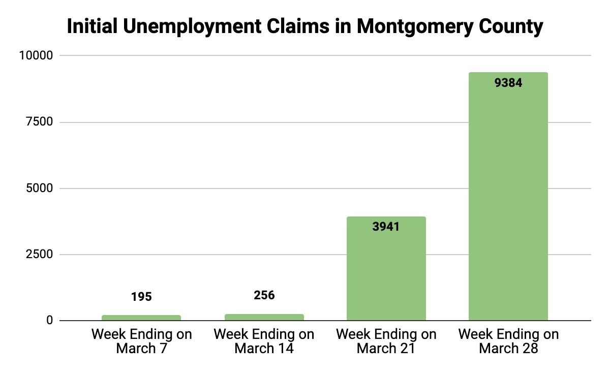 More than 9,000 Montgomery County residents applied for jobless benefits last week as businesses shut their doors to combat the coronavirus.