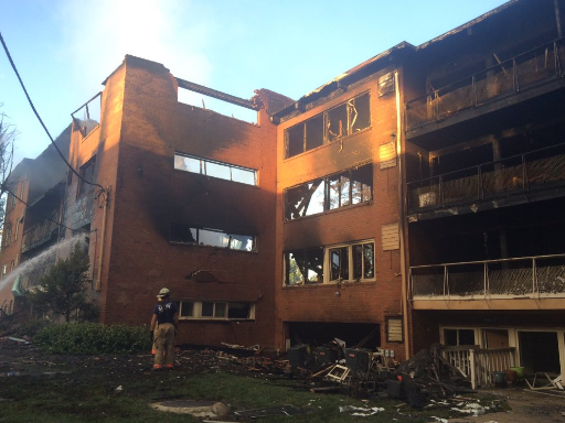 Two four-level apartment buildings at the complex were damaged by the explosion and fire, with displaced residents gathering temporarily at the Long Branch Community Center.