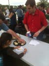 His trick that day was to help us make solar cookies. Ten trays of 50 sugar cookies each were decorated and gobbled in record time by the visitors. Round cookies were spread with plasma icing, sprinkles represented the granular appearance of the photosphere and red stringy licorice looped into solar flares. Yesterday's special treat was to add a curved line of chocolate chips to mimic Venus' transit.