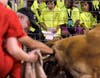 "Crowds gathered around to see a baby Jersey calf being born at the State Fair."