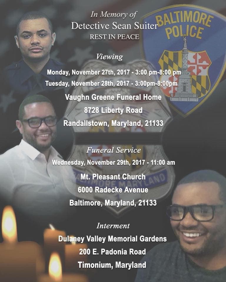 The funeral service for Suiter took place at 11 a.m. on Wednesday, Nov. 29, at Mount Pleasant Church, 6000 Radecke Avenue, Baltimore. Radecke Avenue will be closed to through traffic between Cedonia and Hamilton Avenues from approximately 9:30 a.m. to 3 p.m. on Wednesday for the funeral, the Baltimore Department of Transportation advised.