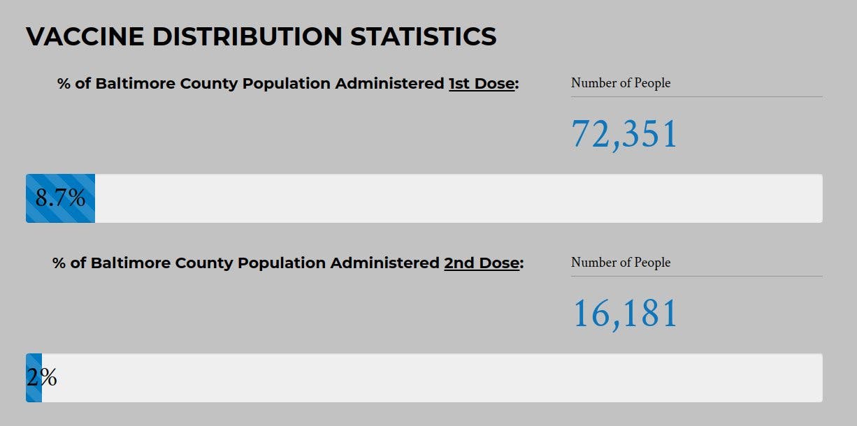 Nearly 9 percent of Baltimore County's population has received the COVID-19 vaccination, county officials say.