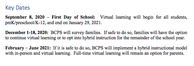 "At this time, students are not scheduled to return to school buildings," according to BCPS. "When invited to do so, families of identified students may choose through an online questionnaire to begin hybrid learning or to continue virtual learning."