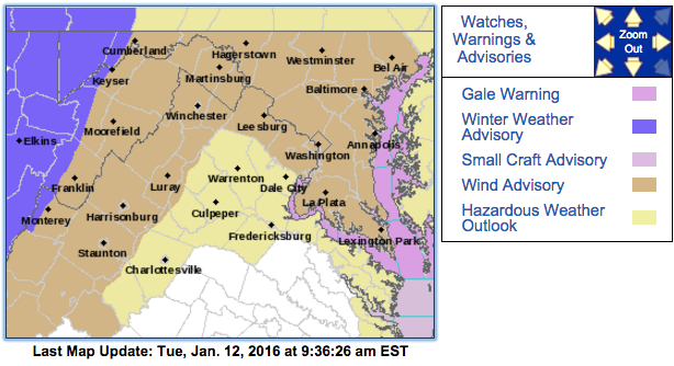 With gusts up to 50 mph possible, the National Weather Service has issued a wind advisory Tuesday for parts of Maryland, Virginia and Washington, D.C.