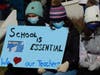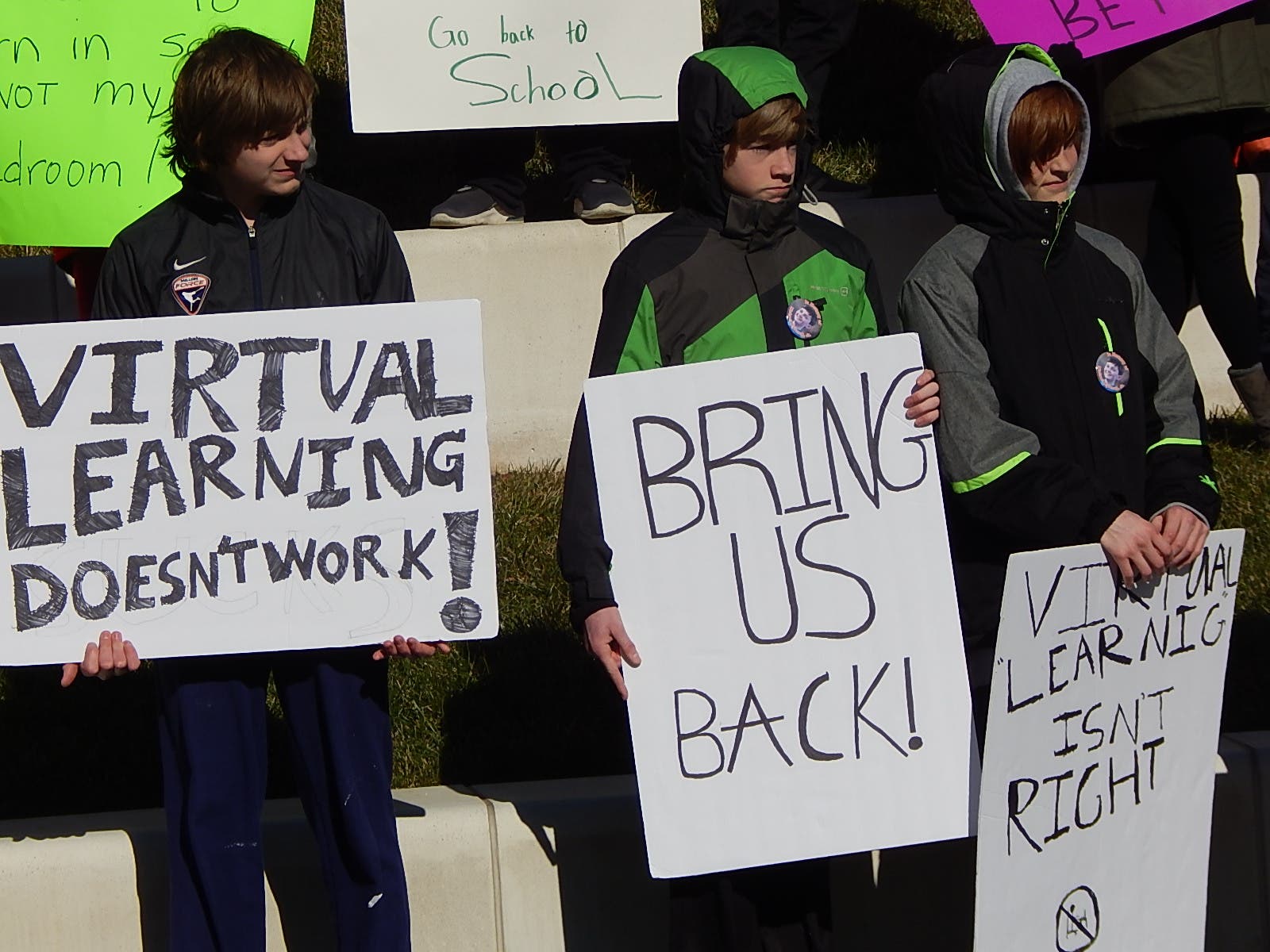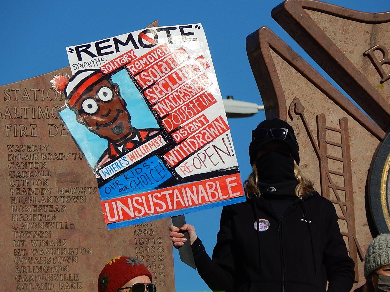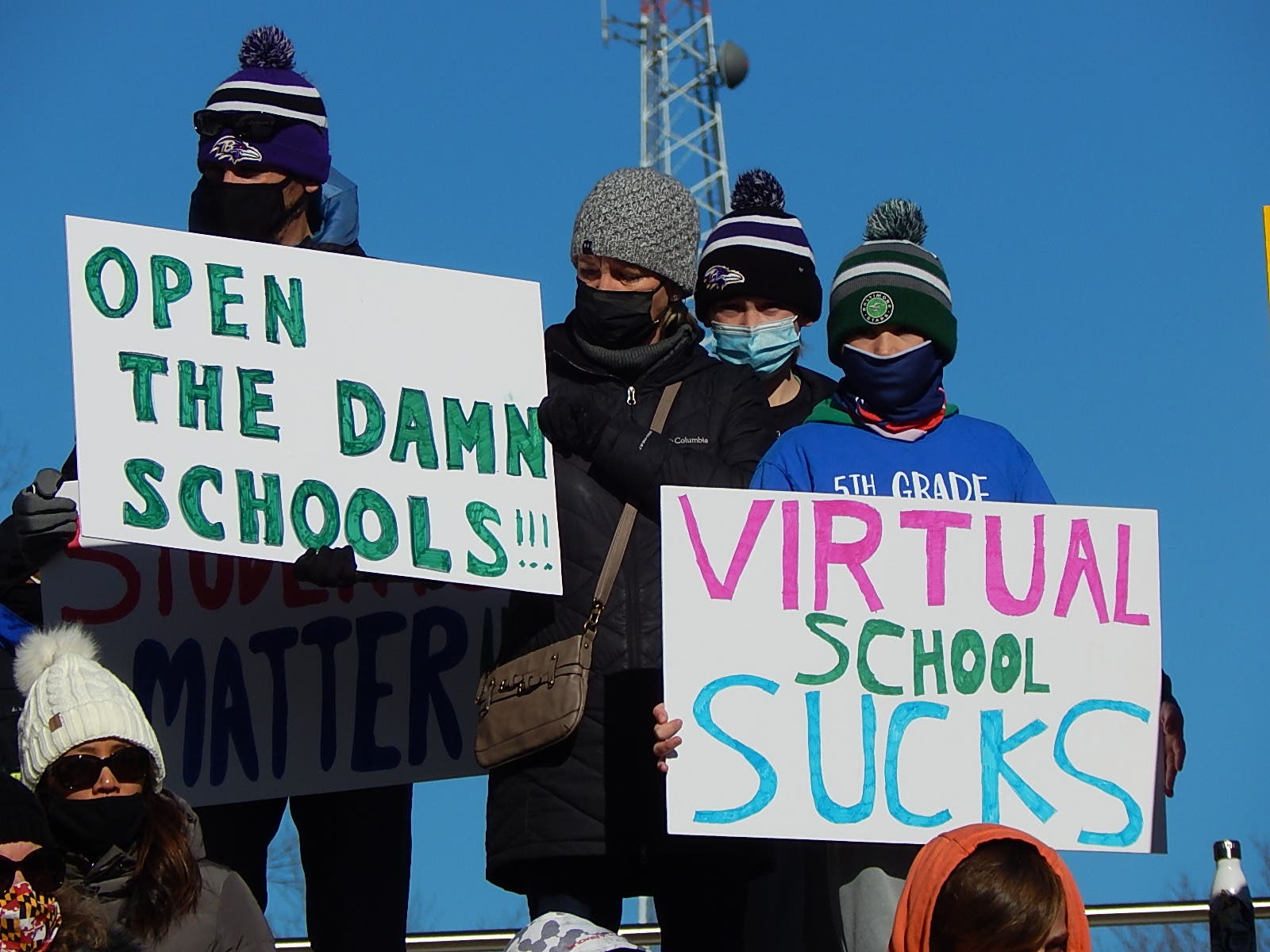 At the Jan. 9 rally at Patriot Plaza in Towson, a handful of children shared they were struggling during at-home learning, holding signs that said things like: "Public school kids matter too."