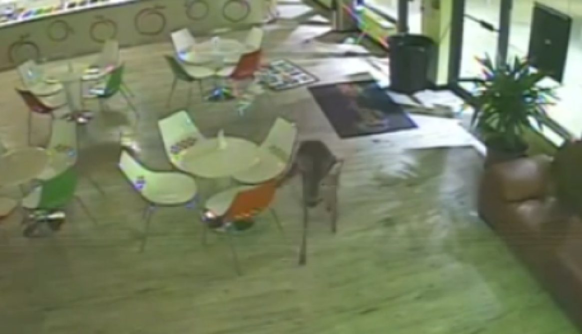 Our Holmdel-Hazlet Patch has this video of a deer breaking into a yogurt shop, frantically running through the store's back and front dining area, slipping around on some pretty slick floors.