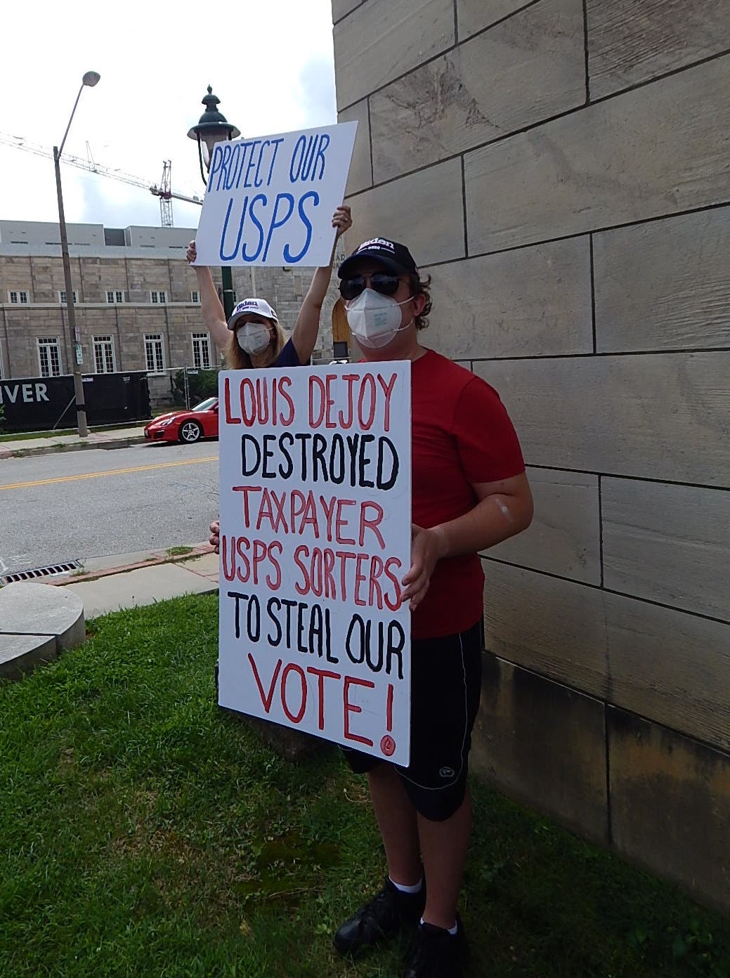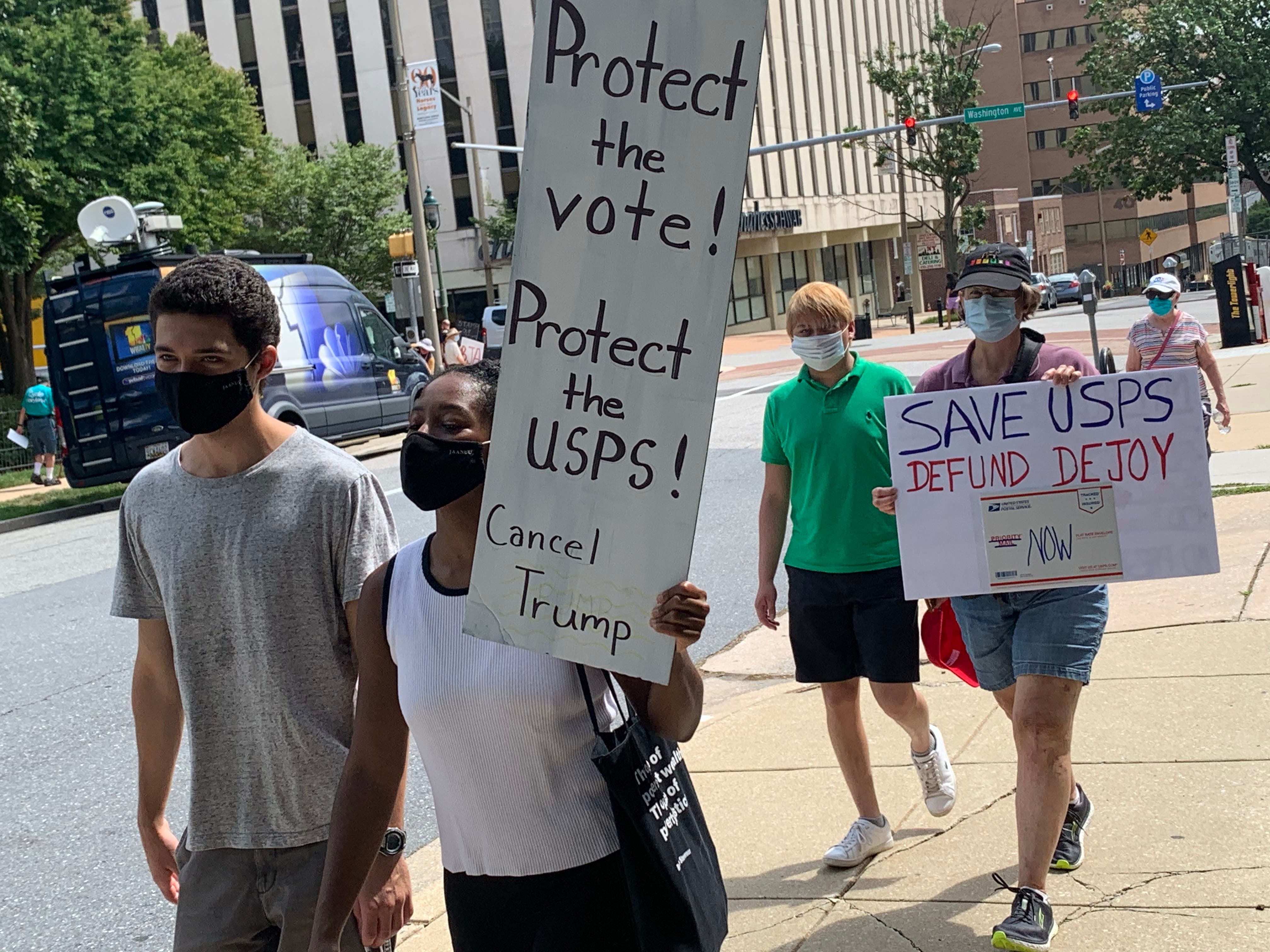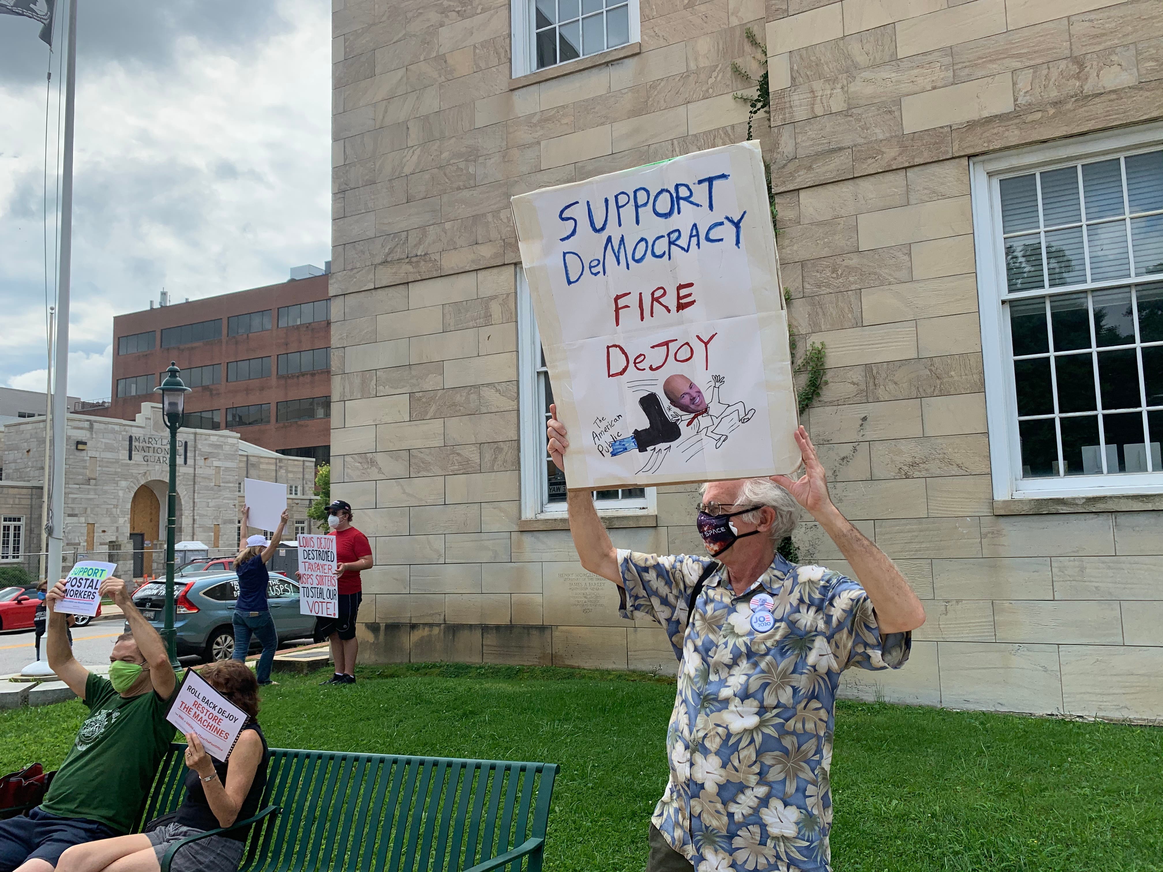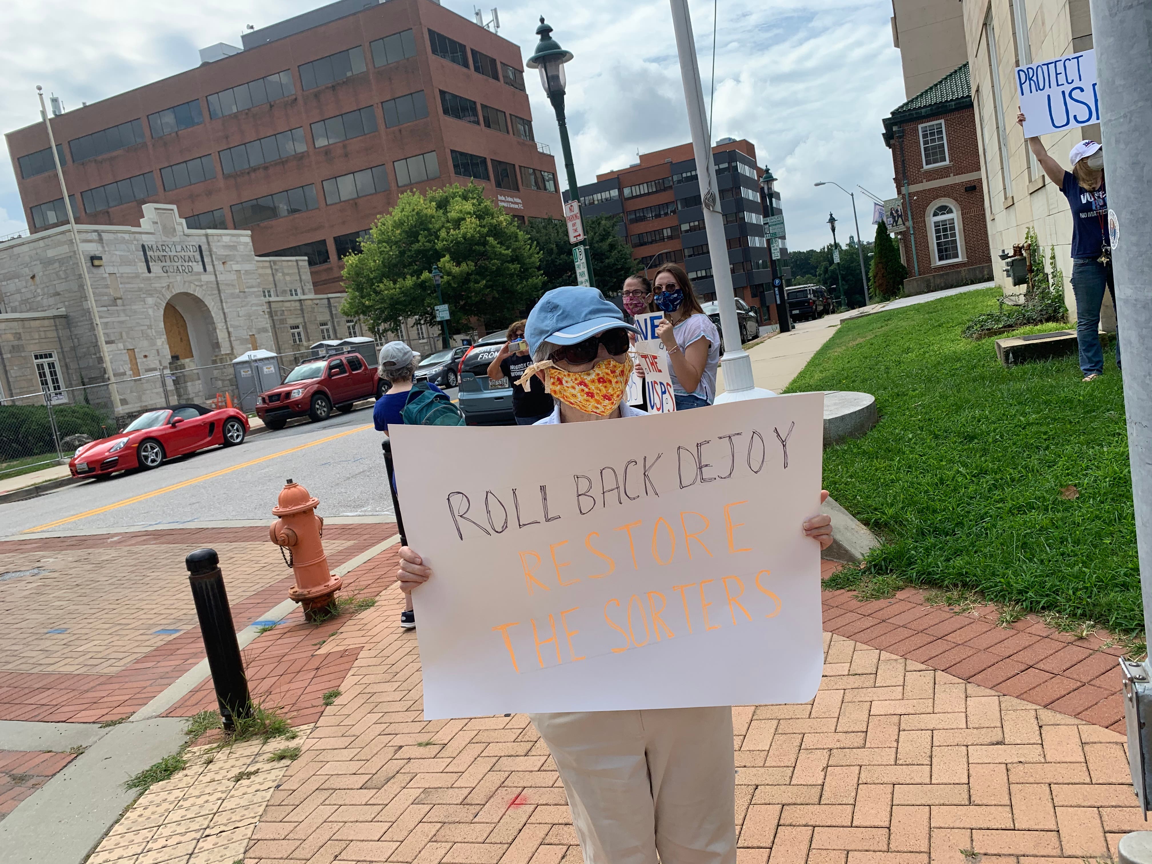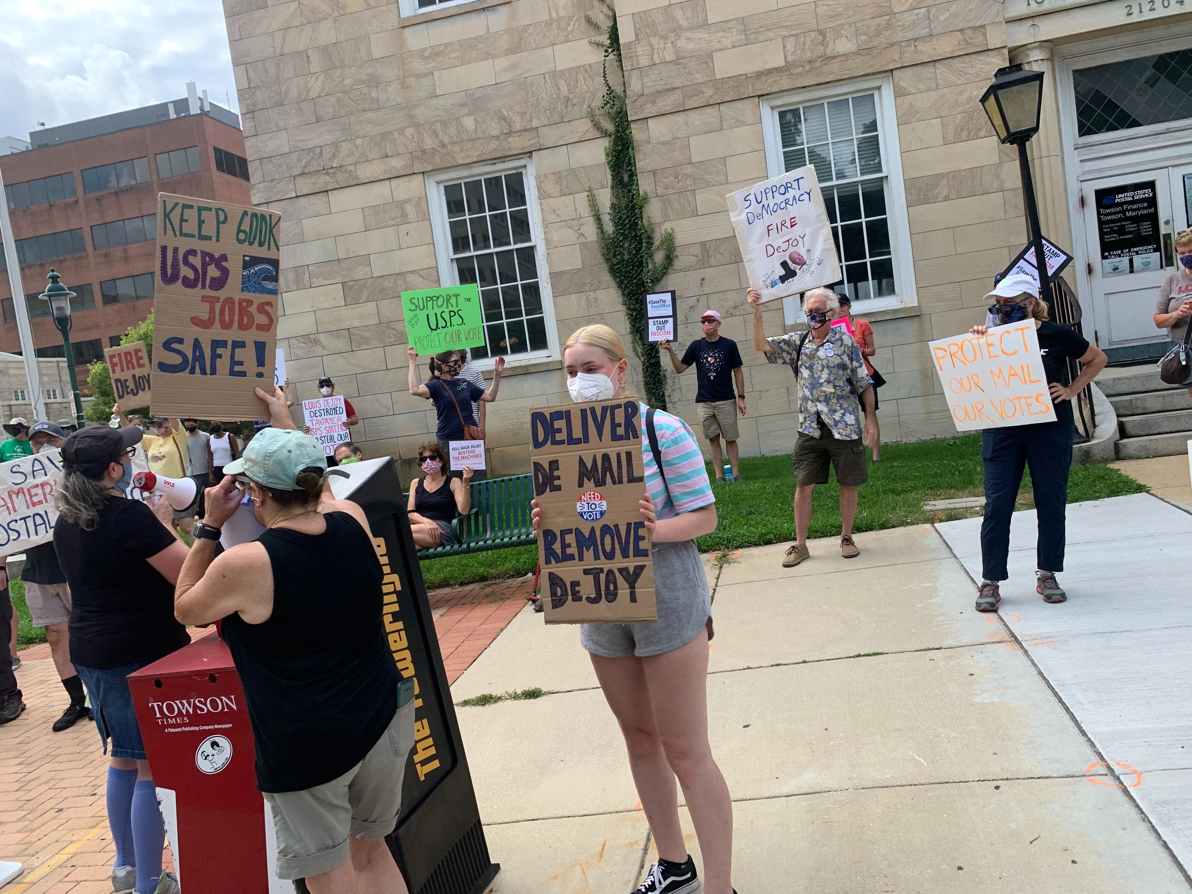 Activists in Towson and around the country called for the removal of Louis DeJoy as postmaster general after they said he made changes like removing high-volume letter sorters and blue collection boxes.