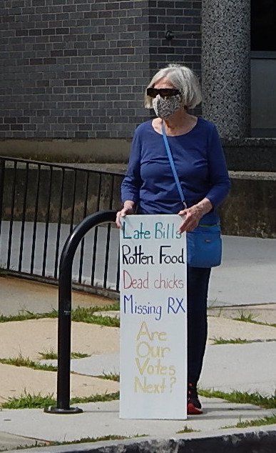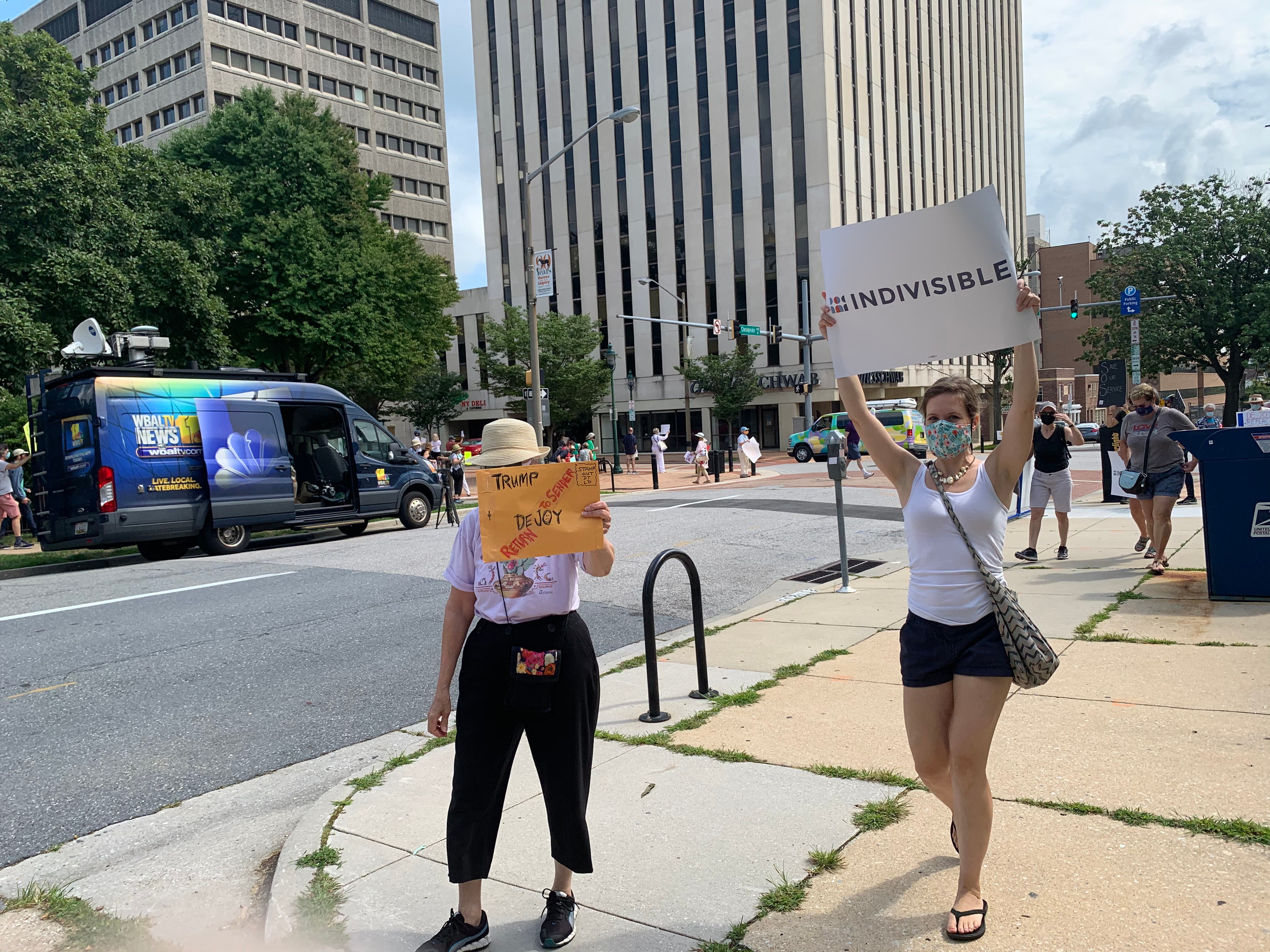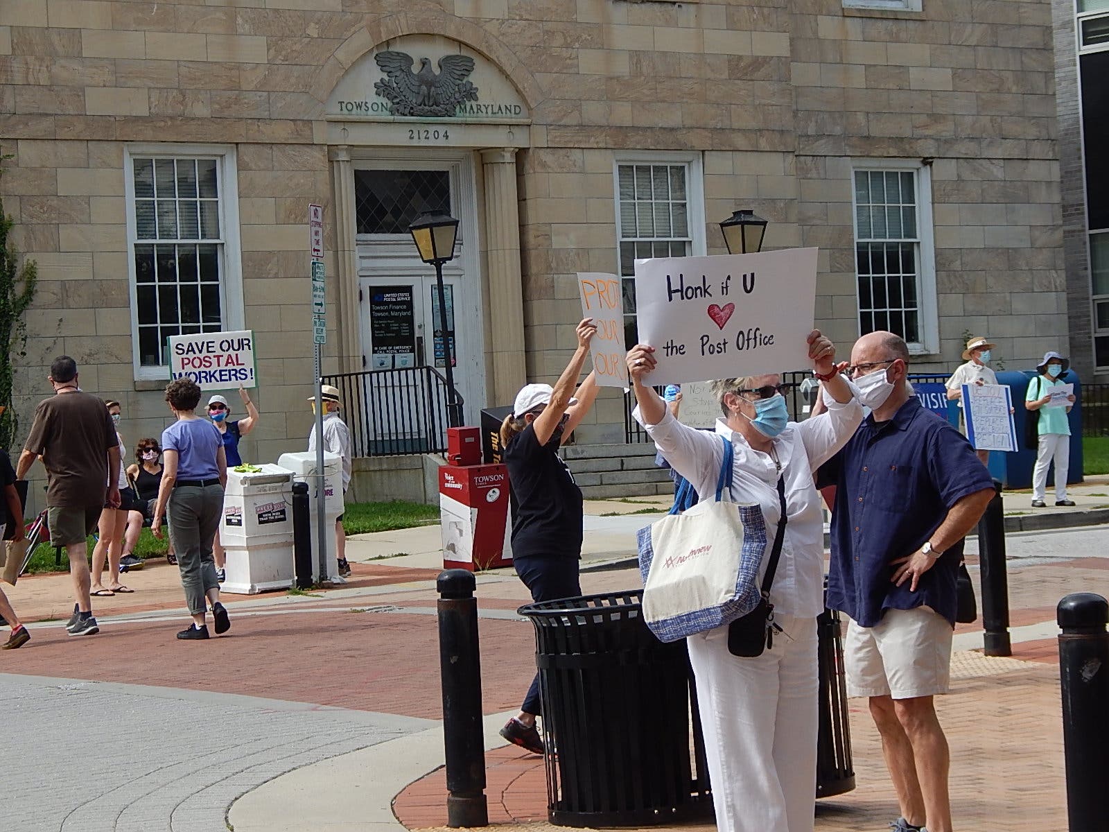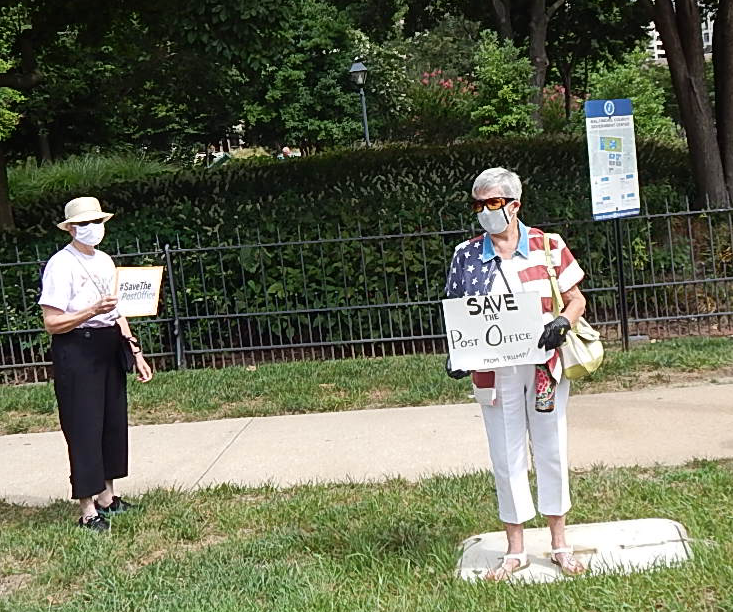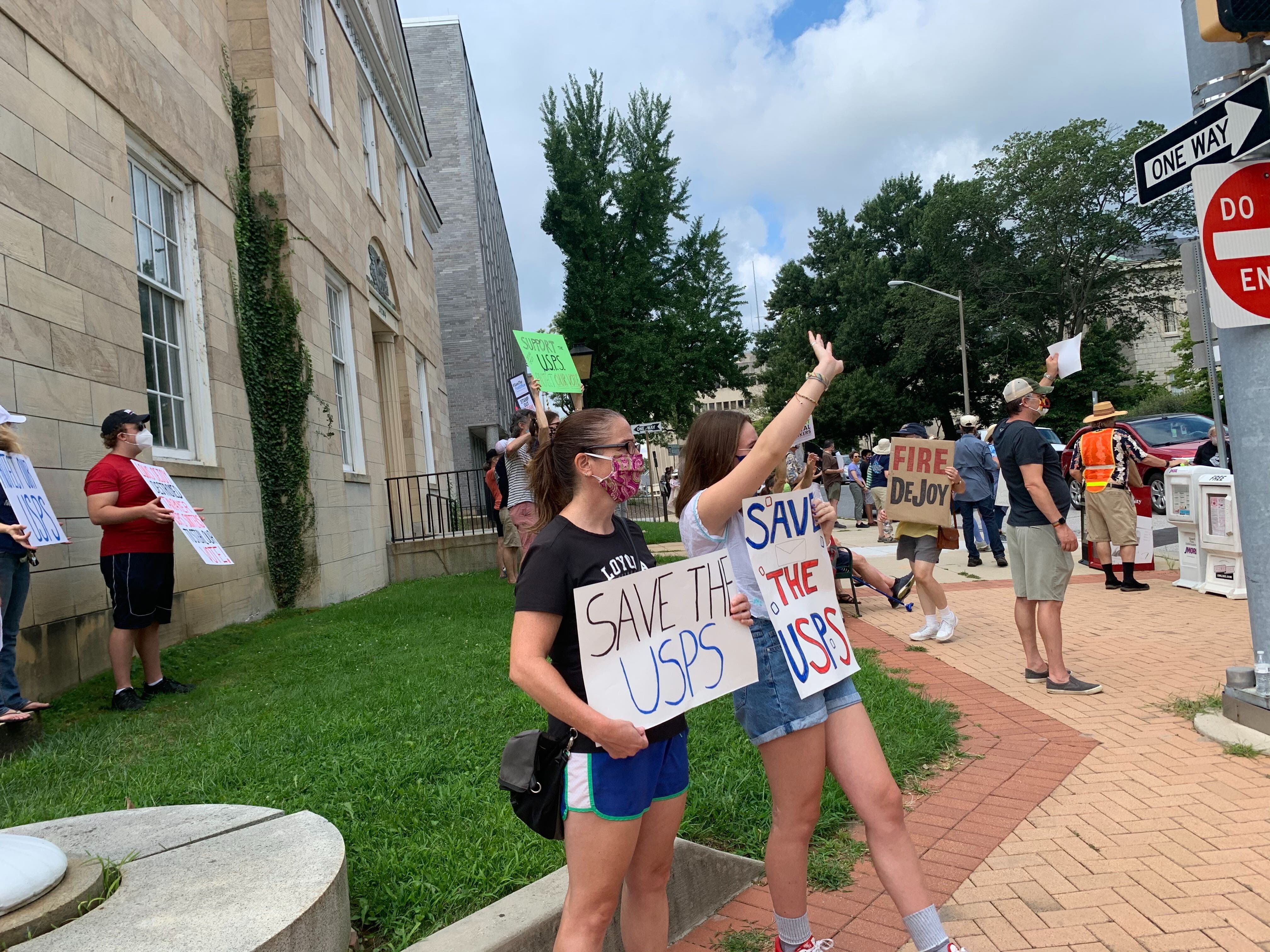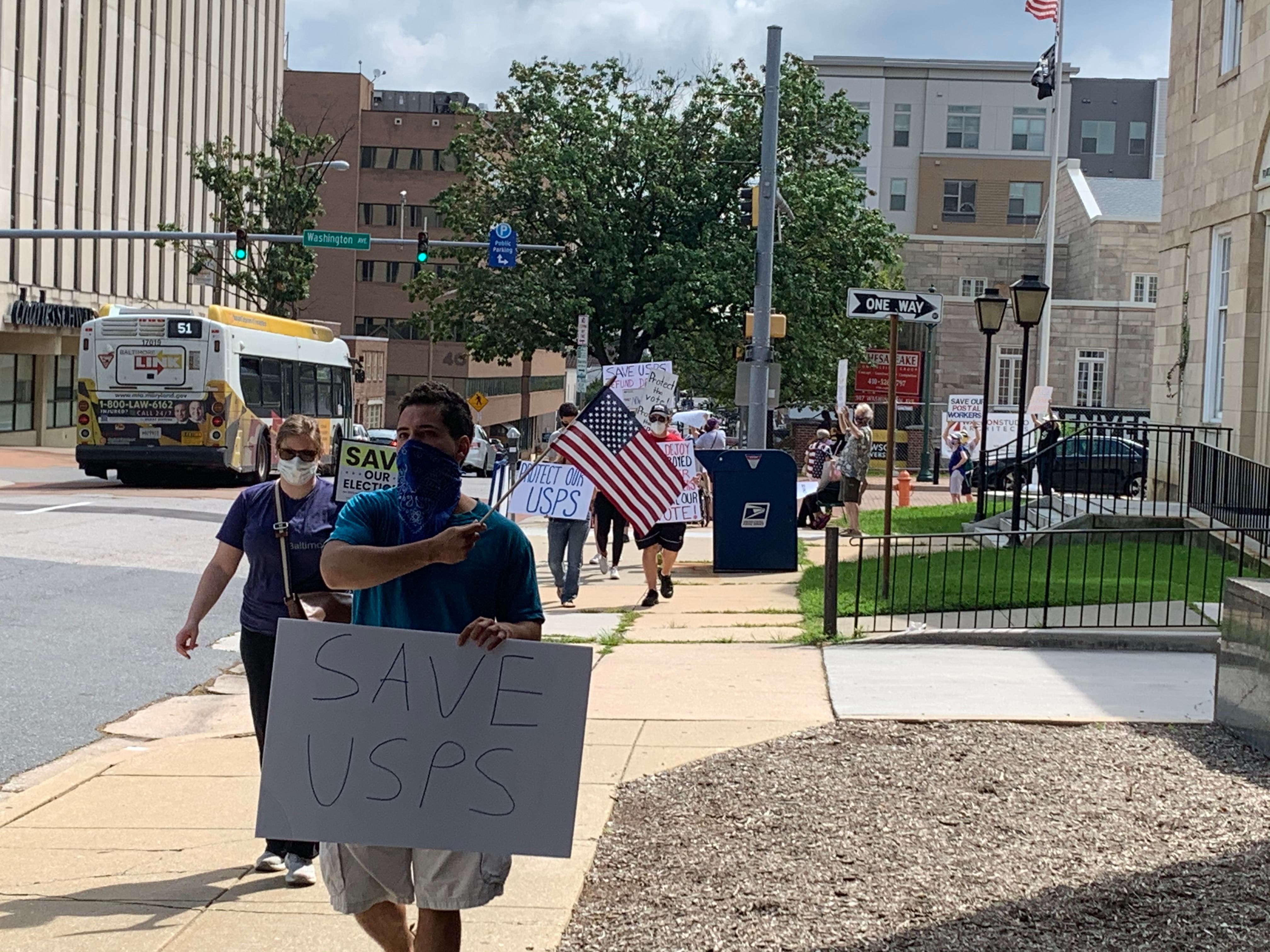 The event was one of hundreds of demonstrations nationwide coordinated by MoveOn.org. Nearby rallies were held in Timonium and Baltimore. As residents turned out for the 11 a.m. protests, the U.S. House of Representatives passed a bill Saturday to provide $25 billion to the USPS. Next it must go before the Senate.
