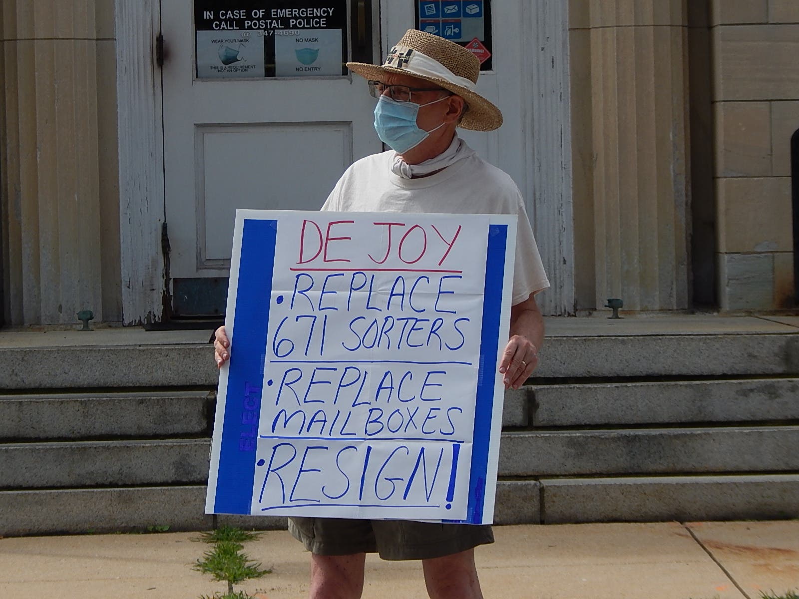 Chanting things like: "Defund DeJoy" and "Hey hey, ho ho, DeJoy has got to go," more than 100 protesters participated in the rally around Chesapeake Avenue Saturday, Mills said.