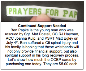 "Ben suffered a C5 spinal injury and his family is hoping that these wristbands will not only provide financial support but also spiritual support in the long recovery process," the beach patrol newsletter said. "Let's show how much the OCBP cares by purchasing one today."