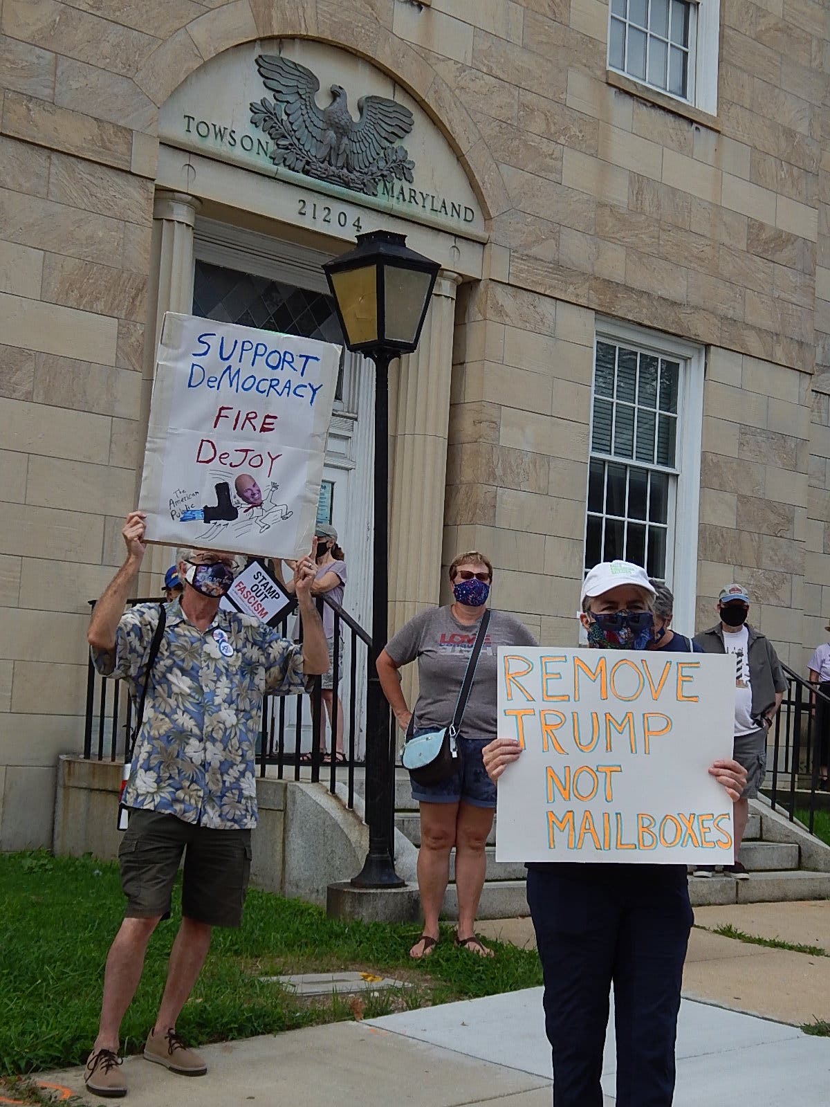 "I was prompted to organize the event when I learned last week of the slowdowns at the U.S. Postal Service caused by Postmaster [General] Louis DeJoy's massive reorganization of the USPS, and the removal of high-volume sorting machines, and blue mail collection boxes," said Marta Mills, who organized the Towson Save the Post Office rally as a member of Indivisible Towson.