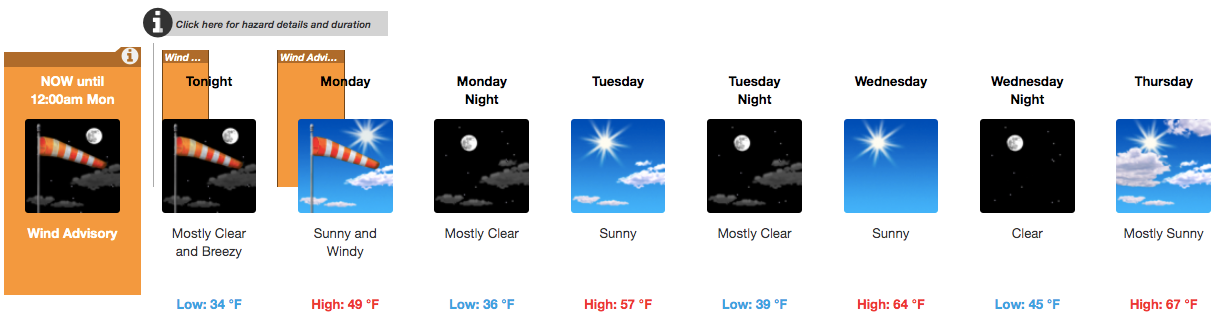During the wind advisory period, people should secure any loose objects that may be hazardous, such as decorations. Tree limbs may blow down and power outages are possible.