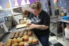 A local bakery owner celebrates her eatery's nine-year anniversary with quirky-flavored cupcakes topped with enthusiasm.