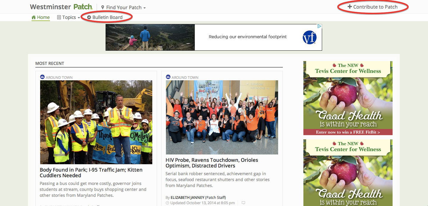 Two user-interaction opportunities are found on the home page of every Patch. They’re circled in red: “Bulletin Board” and “Contribute to Patch.” (Screenshot: Patch.com)