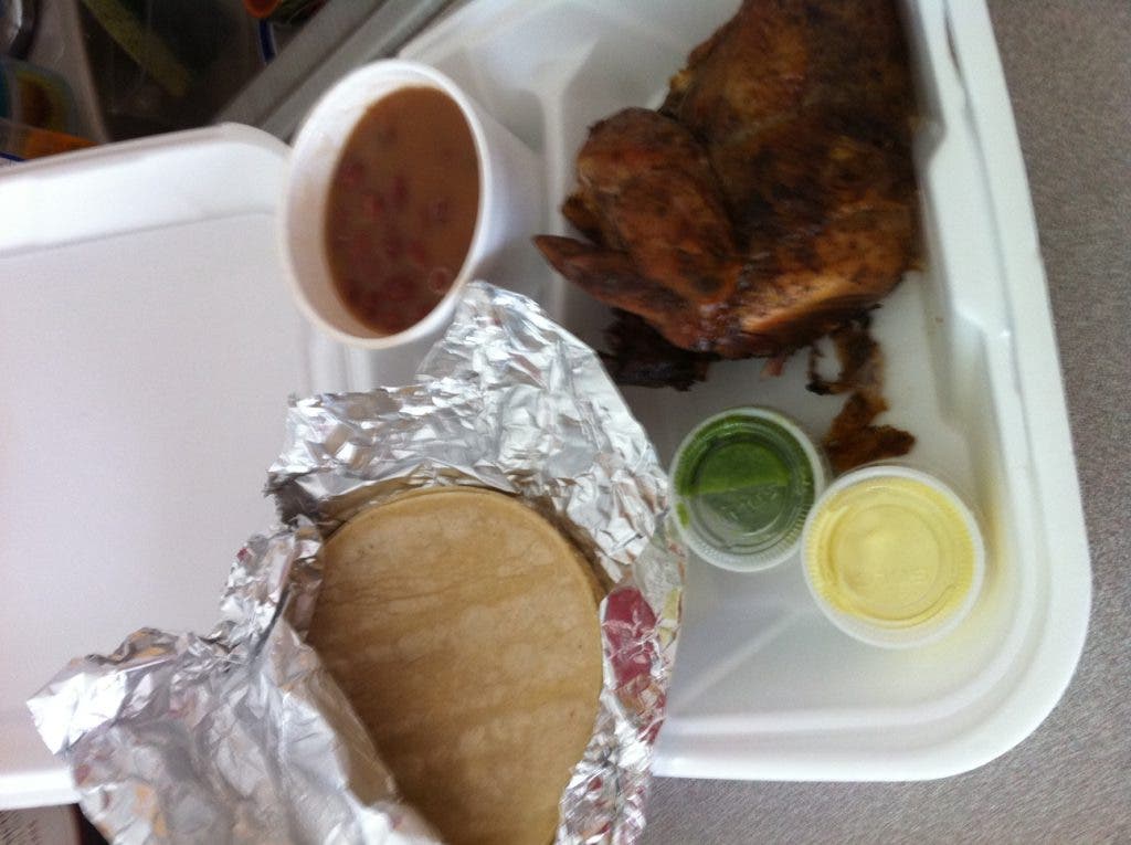 The two hungry lunch-goers in front of me had ordered half-chickens, so I got a good sense of the size of what I was dealing with. I ordered a quarter chicken, which came with two sides (I chose beans and tortillas) and two sauces, and a can of peach nectar. The total came to about seven and a half dollars.
