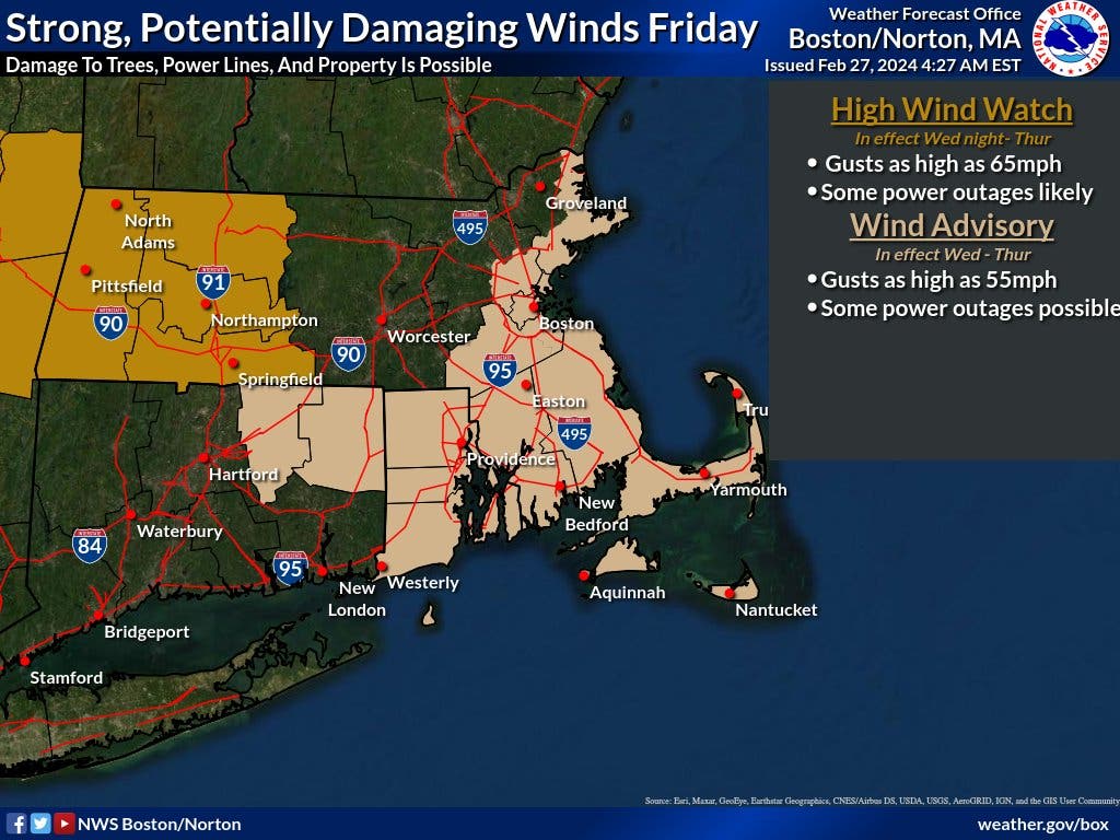MASSACHUSETTS — A return — and perhaps last gasp? — of winter will follow the unseasonably warm start to the week across Massachusetts with heavy rain, potentially damaging wind and a day of frigid wind chills moving into the region.