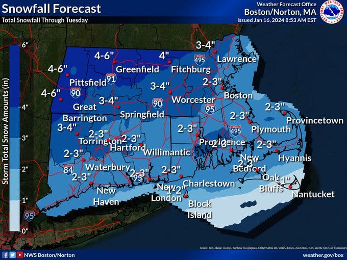 MASSACHUSETTS — A long-duration snow event will drop up to 6 inches of snow across some parts of Massachusetts — with most of the state getting between 2 and 4 inches on Tuesday — before cold air settles in across the region and causes a hard freeze for any spots that mix with rain during the latest storm.