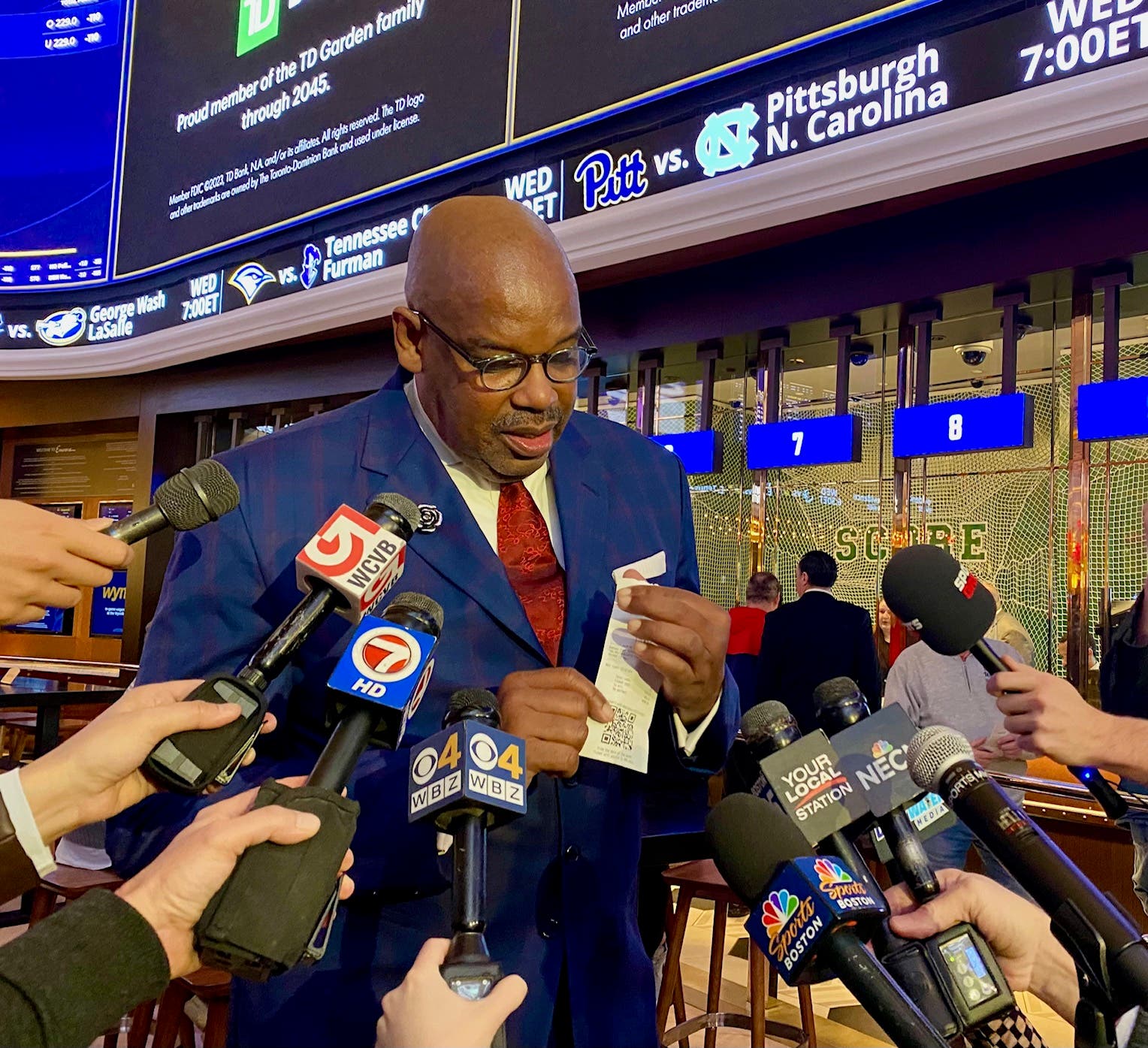 EVERETT, MA – Some of the heroes of New England's much-celebrated recent sports past were there to welcome what could be a big part of that future for many fans when champions from the four major professional teams were among the first to place legal sports wagers in Massachusetts at the Encore Boston Harbor Casino Tuesday morning.