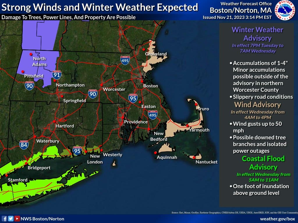 MASSACHUSETTS — While most of the Greater Boston area will deal with a wind-swept rain late Tuesday night into Wednesday morning, those traveling well north and west of the city will have to get into winter driving mode with up to four inches of snow expected from a pre-Thanksgiving storm raging across the country early this week.