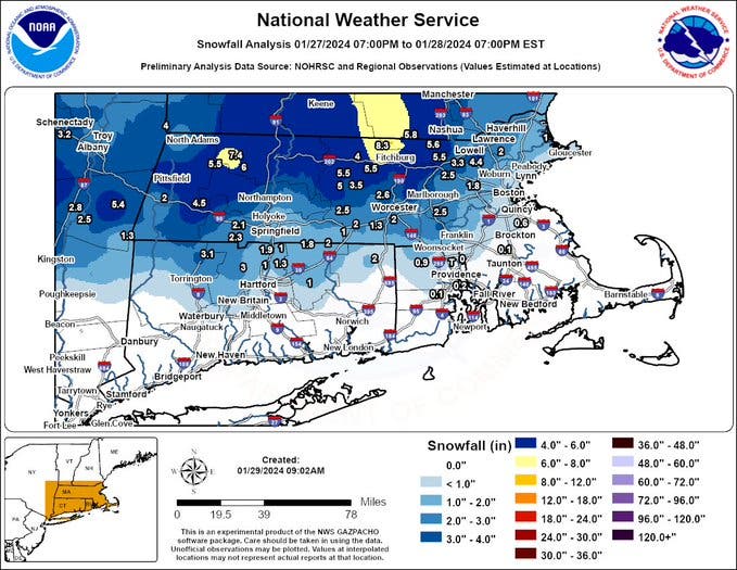 A Gale Warning remained in effect offshore but the NWS lifted all Winter Storm Watch and Winter Storm Warning alerts across Massachusetts.