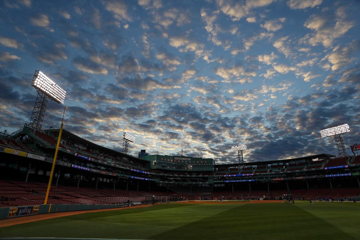 Clouds fill the sky over Fenway Park as the Los Angeles Dodgers practice for Game 1 of the World Series baseball game against the Boston Red Sox Monday, Oct. 22, 2018, in Boston. (AP News)