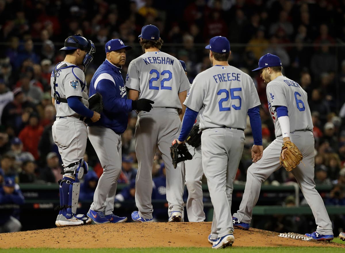 Los Angeles Dodgers manager Dave Roberts relieves starting pitcher Clayton Kershaw (22) during the fifth inning of the first game. (AP News)