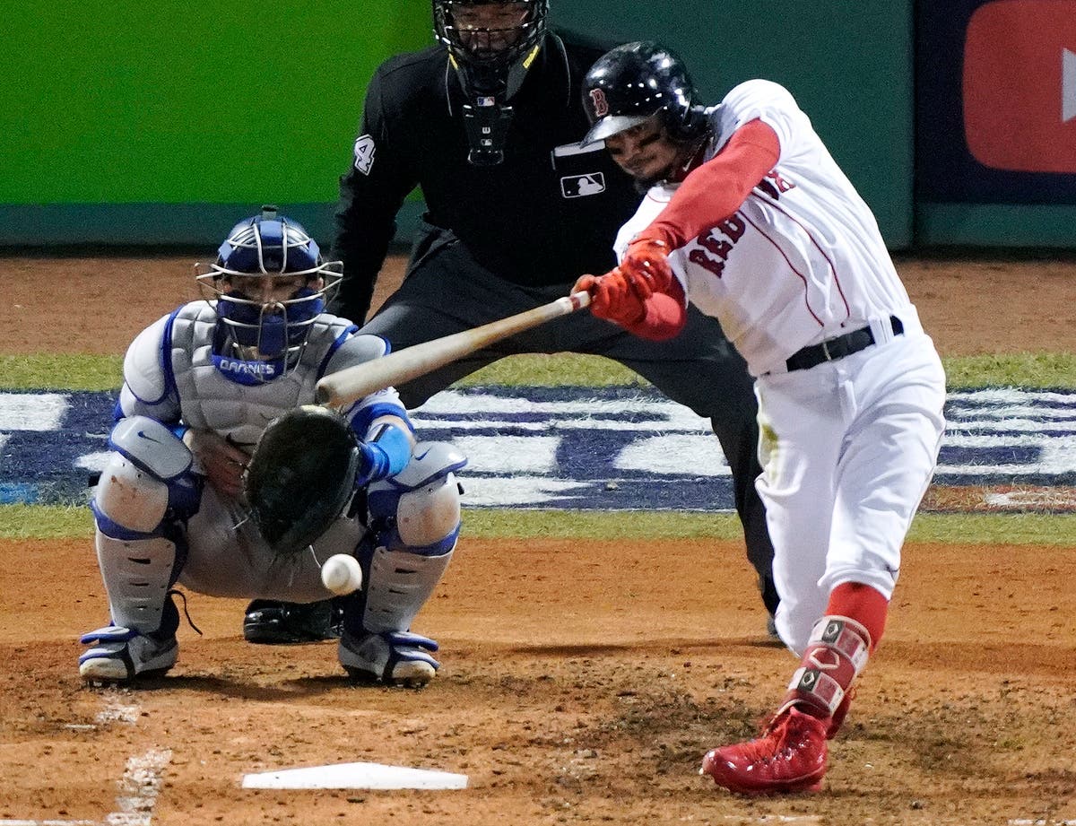 Boston Red Sox's Mookie Betts hits a single in front of Los Angeles Dodgers catcher Austin Barnes during the fifth inning in Game 2. (AP News)