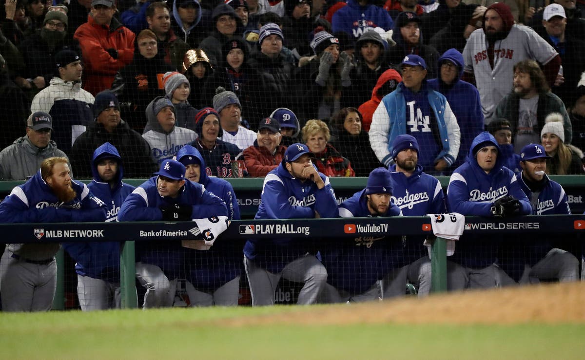Los Angeles Dodgers watch the ninth inning from their dugout during Game 4 of the World Series baseball game against the Boston Red Sox on Saturday, Oct. 27, 2018, in Los Angeles. (AP News)