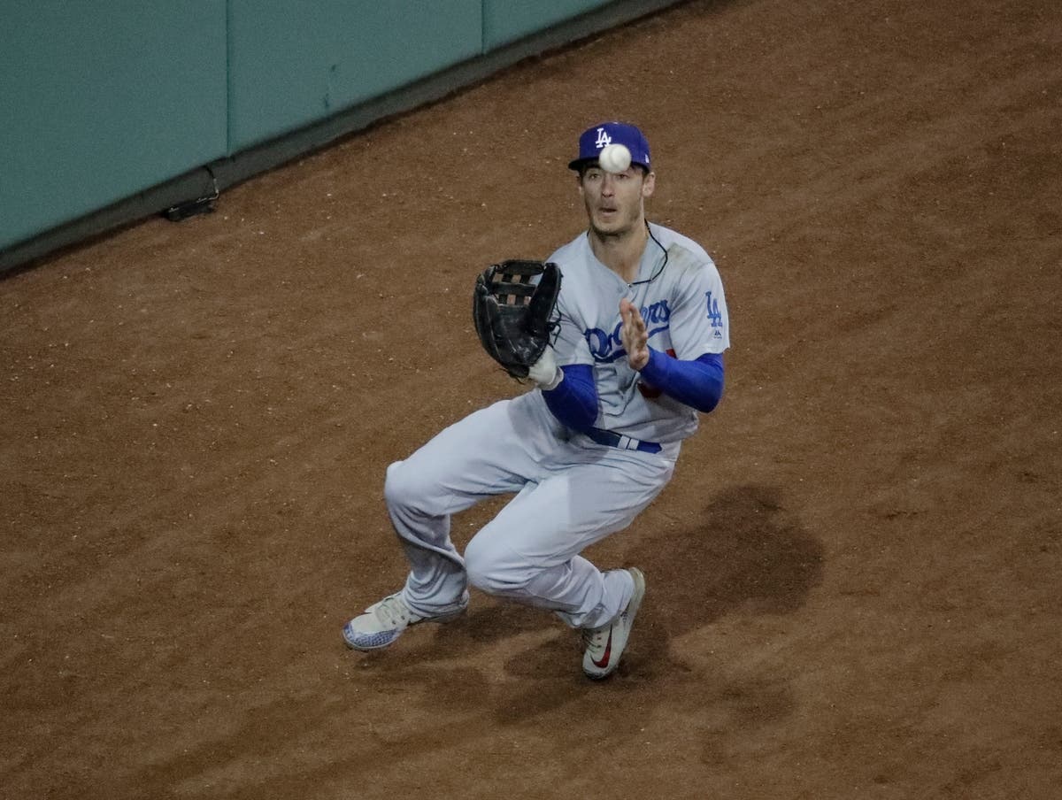 Los Angeles Dodgers' Cody Bellinger makes a sliding catch on a ball hit by Boston Red Sox's J.D. Martinez during the eighth inning of Game 2. (AP News)