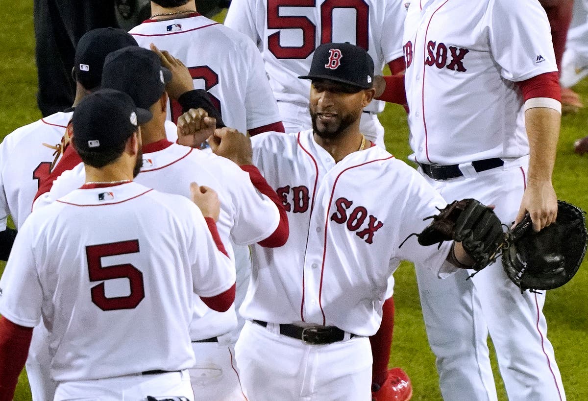 Boston Red Sox's Eduardo Nunez, right, celebrates after defeating the Los Angeles Dodgers 8-4 in of Game 1 of the World Series baseball game Tuesday, Oct. 23, 2018, in Boston. (AP News)