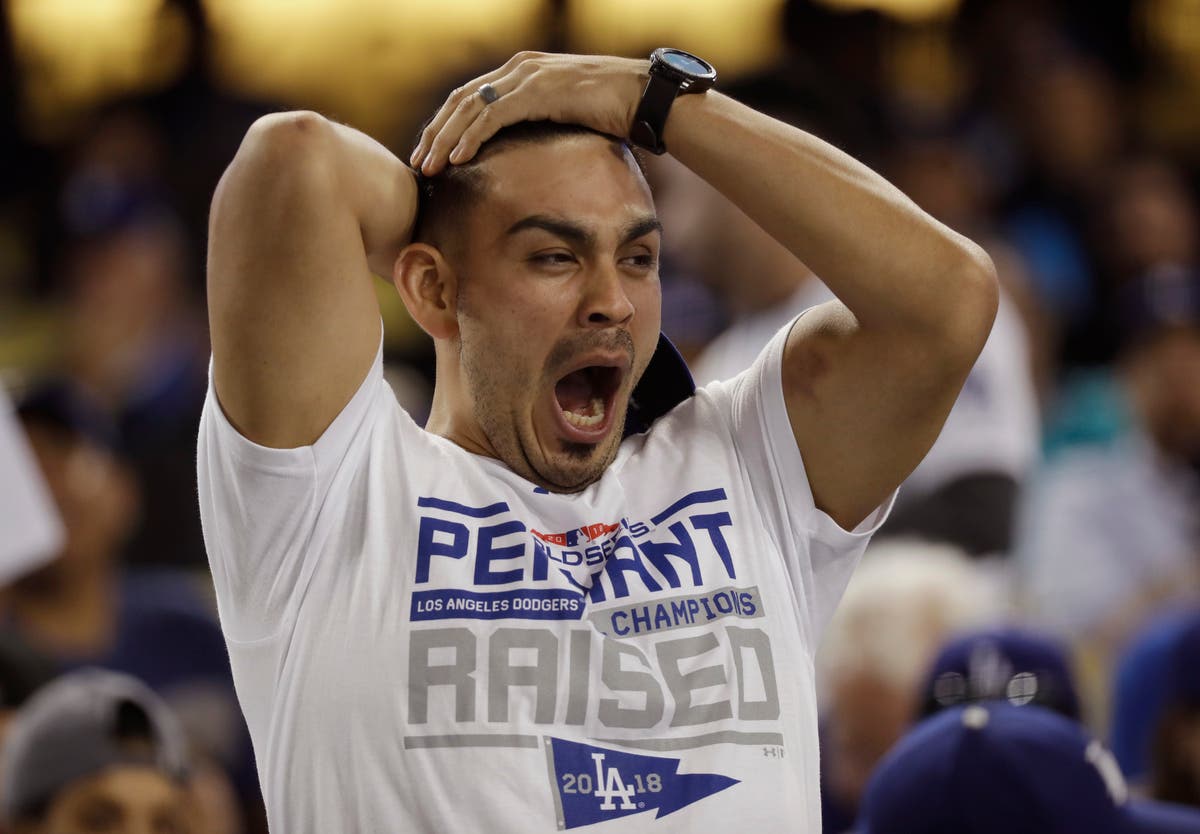 A fan covers his face before the start of the 17th inning in Game 3. (AP News)