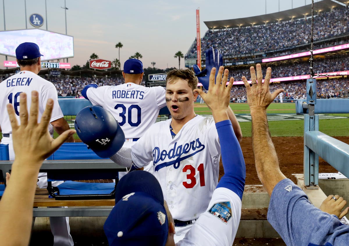 Los Angeles Dodgers' Joc Pederson celebrates in the dugout after a home run against the Boston Red Sox during the third inning in Game 3. (AP News)