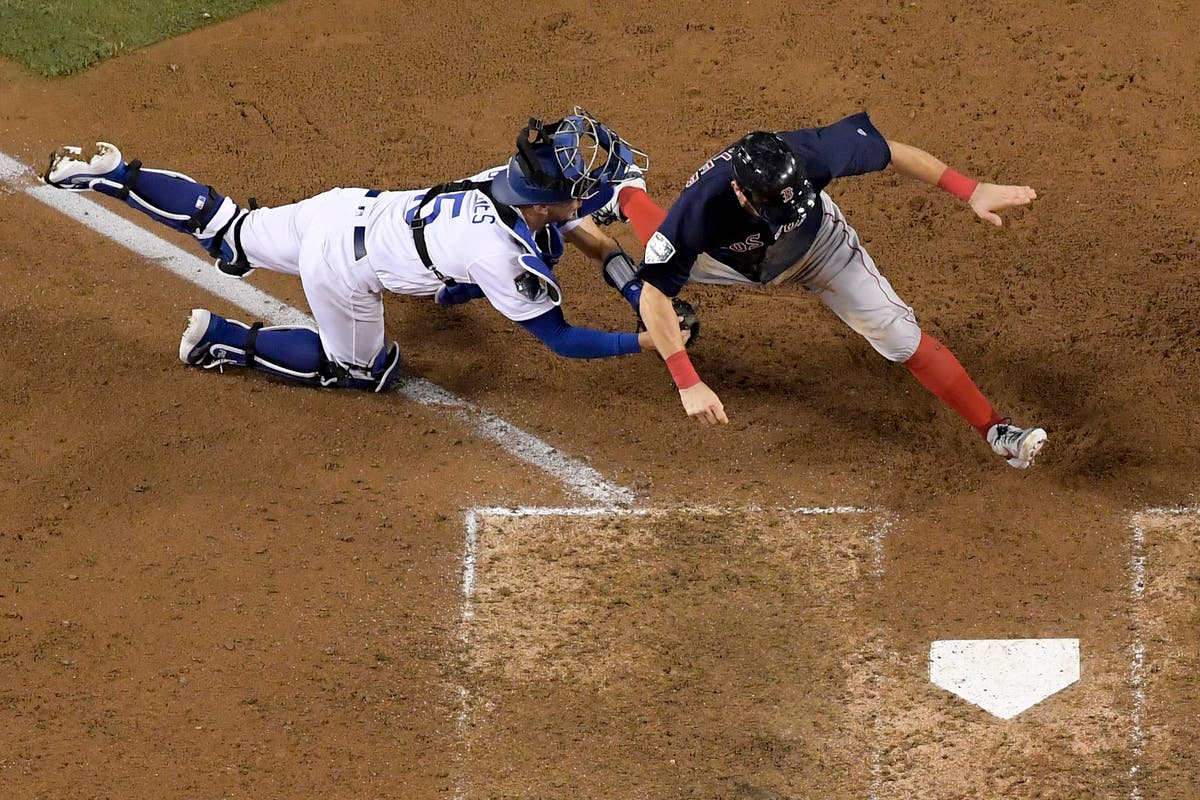 Boston Red Sox's Andrew Benintendi scores past Los Angeles Dodgers catcher Austin Barnes on a hit by J.D. Martinez during the fifth inning of Game 2.