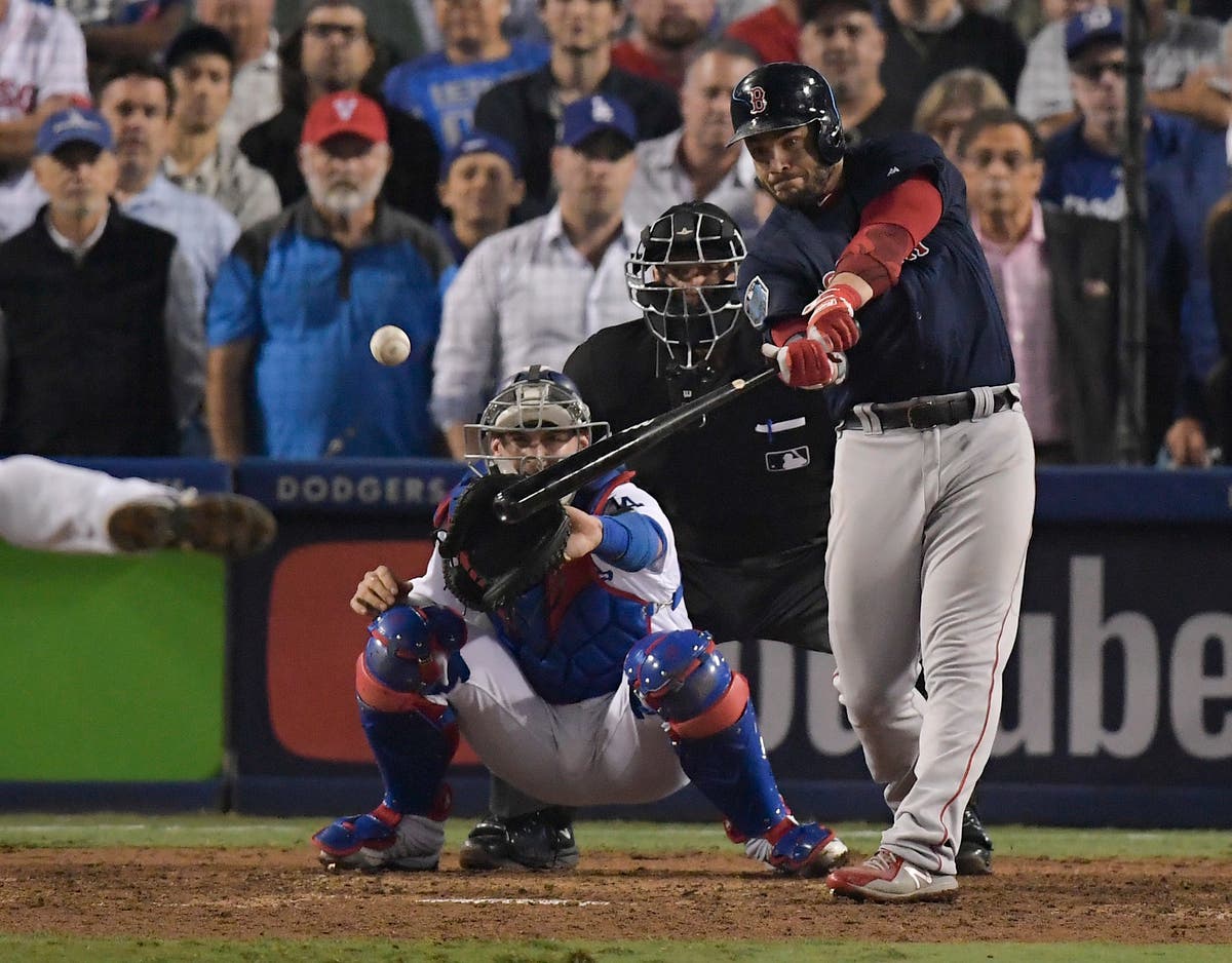 Boston Red Sox's Steve Pearce hits a three RBI-double against the Los Angeles Dodgers during the ninth inning in Game 4. (AP News)