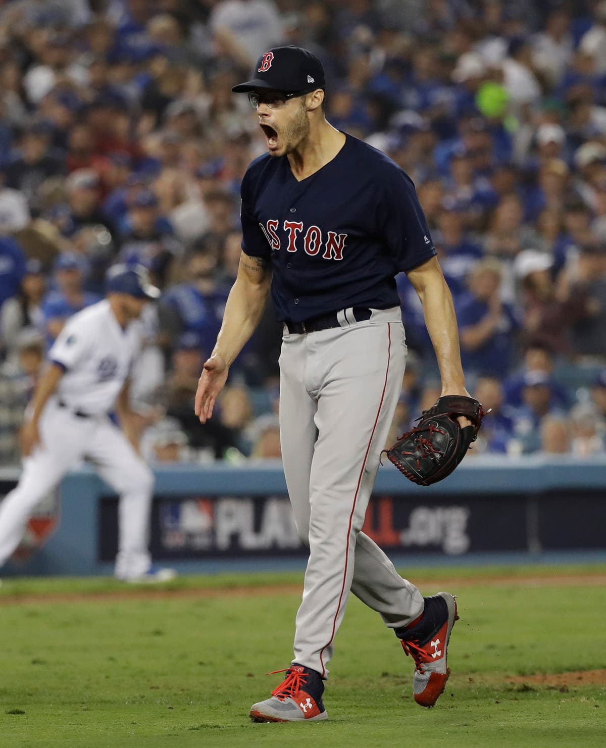 Boston Red Sox's Joe Kelly reacts after striking out Los Angeles Dodgers’ Yasmani Grandal to end the eighth inning in Game 4. (AP News)