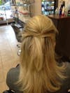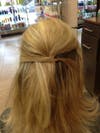 Start by prepping your hair with some strong hold mousse. (Natalie of our Davis Square location recommends Framesi’s BY Sparkling Mousse Strong). Work through your hair, smoothing out the top and preparing the rest for a flexible hold. Begin the updo by lightly backcombing a “U”-shaped section at the crown of your head, taking the front section back, and pin in place. (PHOTO 2)
