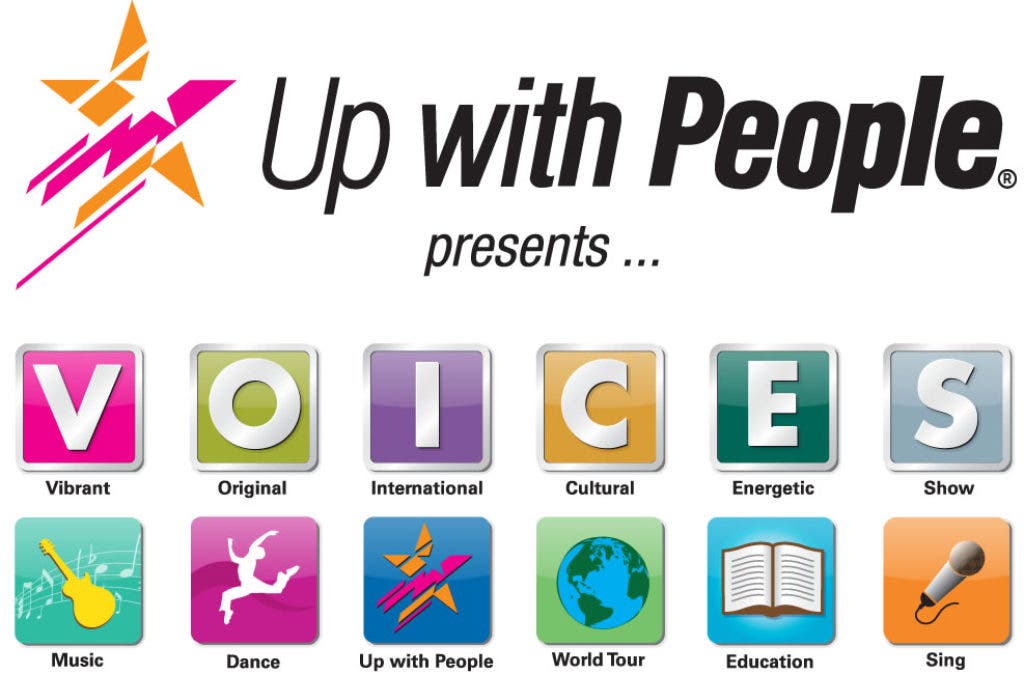 Up with People’s all-new production is entitled “Voices” which features the energy and talent of a cast and staff of 100 representing 20 countries. The live two-hour performance includes both original and popular music and is a dynamic blend of feature soloists, full cast production numbers, fast-moving choreography and colorful costumes.